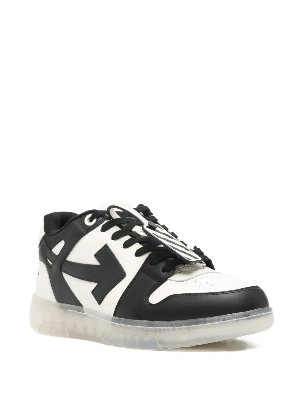 Черный и белый кожаный верх, прозрачная резиновая подошва, мотив со стрелкой, шнуровка, фирменная бирка