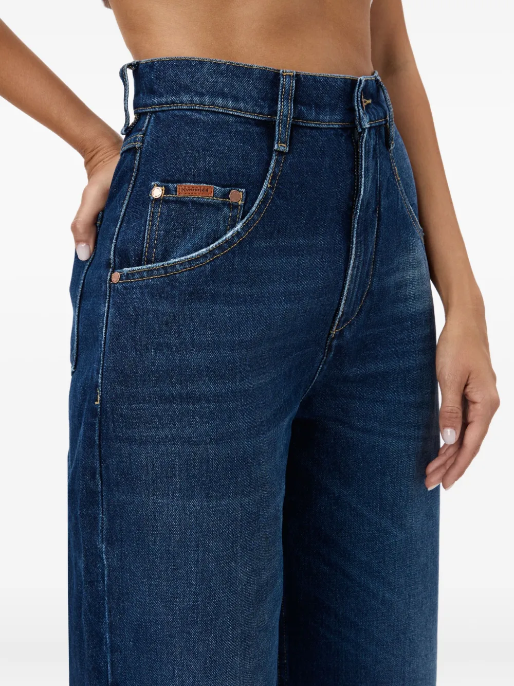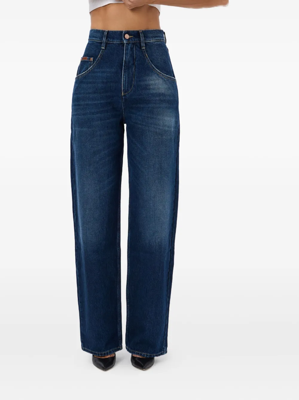 Темно-синие джинсы с высокой талией, пятью карманами, застежкой на пуговицы и изогнутой кокеткой