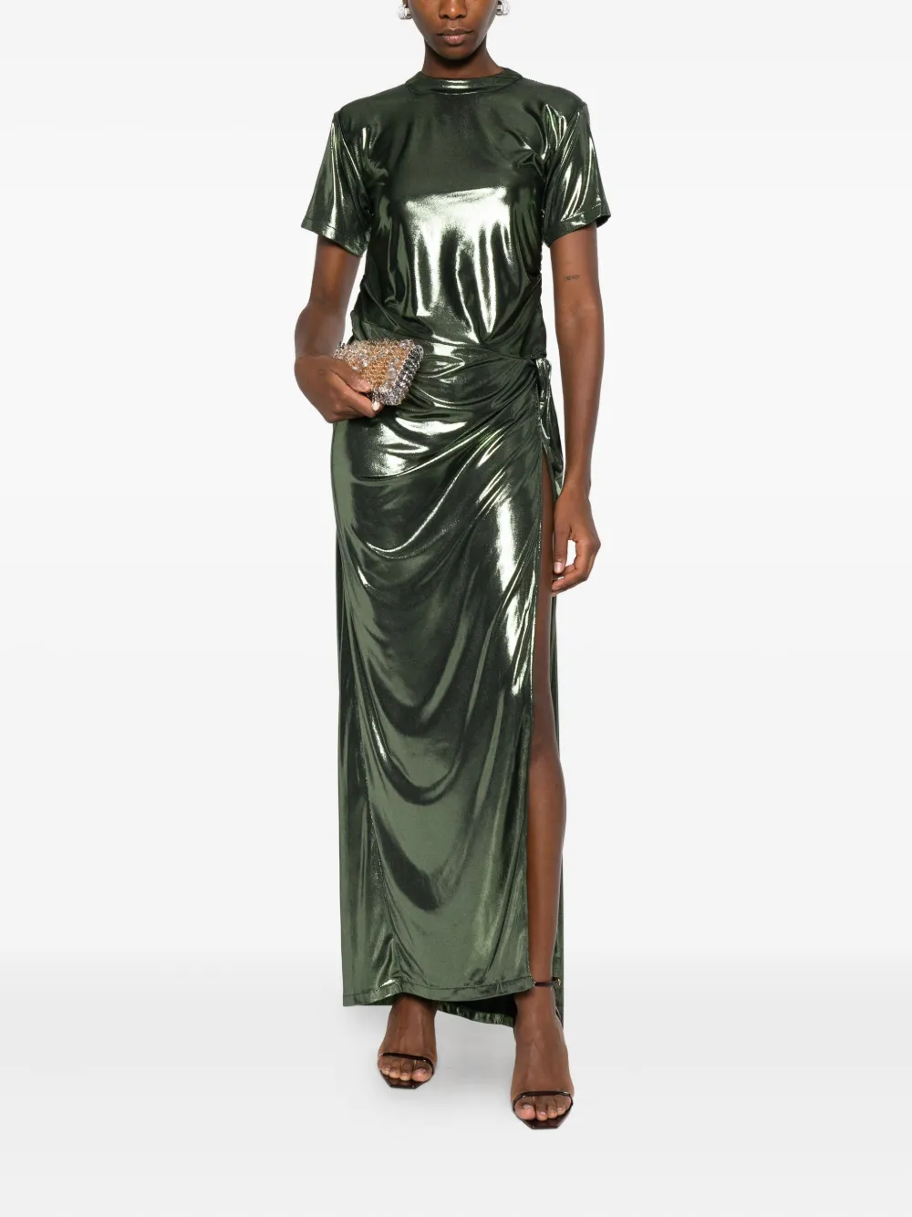 Оливковый зеленый цвет, металлизированный эффект, драпированный дизайн, разрез сбоку, короткие рукава, круглый вырез