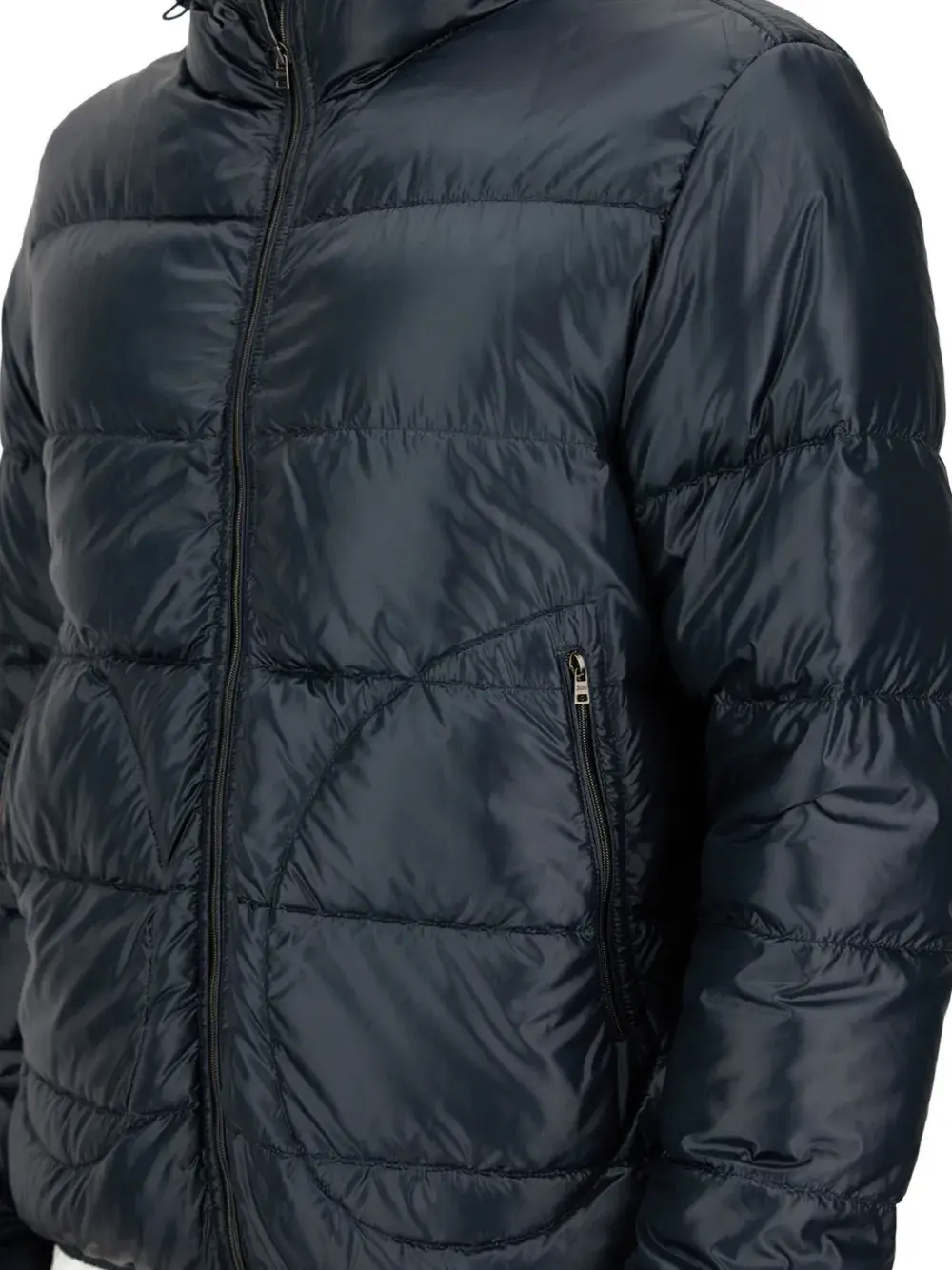 Темно-синий стеганый дизайн, капюшон, застежка на молнию, прорезные карманы, длинные рукава