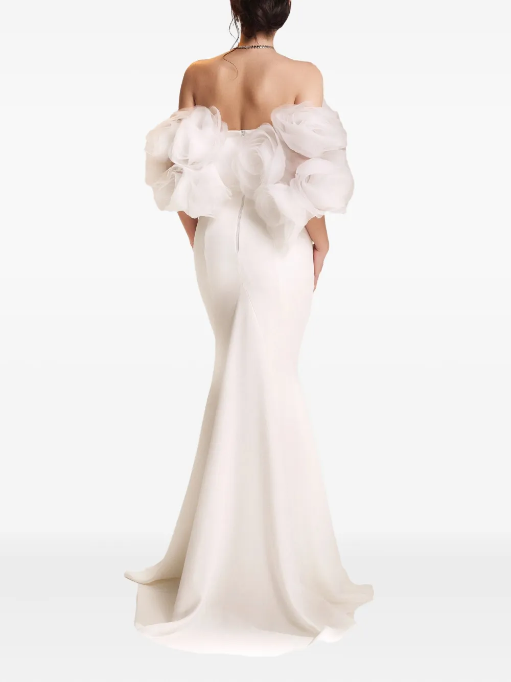 Белое платье с открытыми плечами, оборками на лифе, юбкой-рыбкой, прилегающим силуэтом и длиной в пол