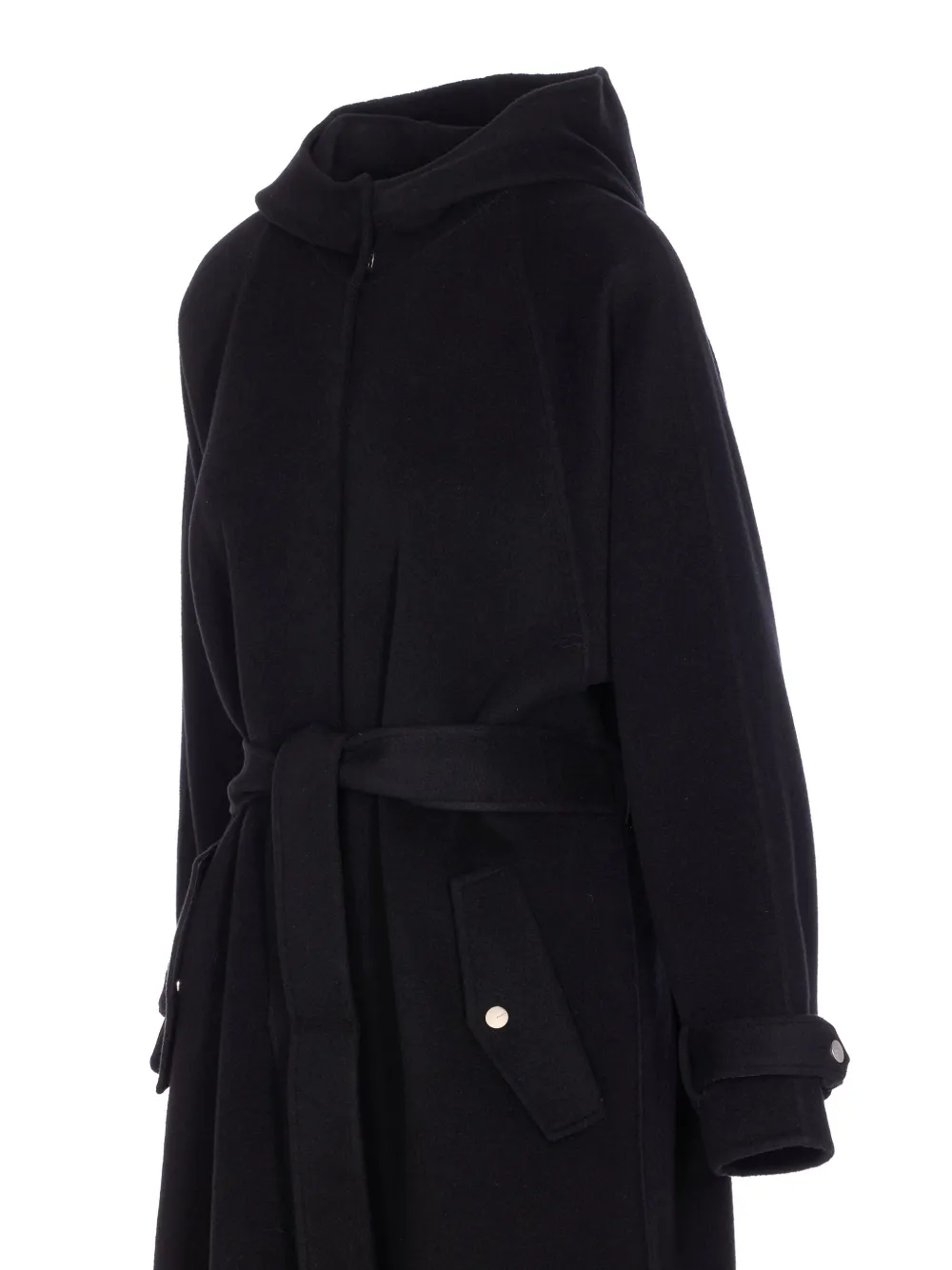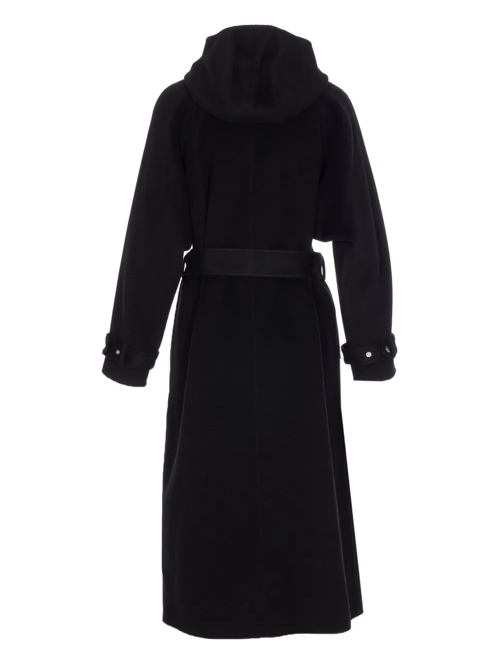Черные реглан-рукава, пояс на завязке, капюшон, прорезные карманы, застежка на пуговицы