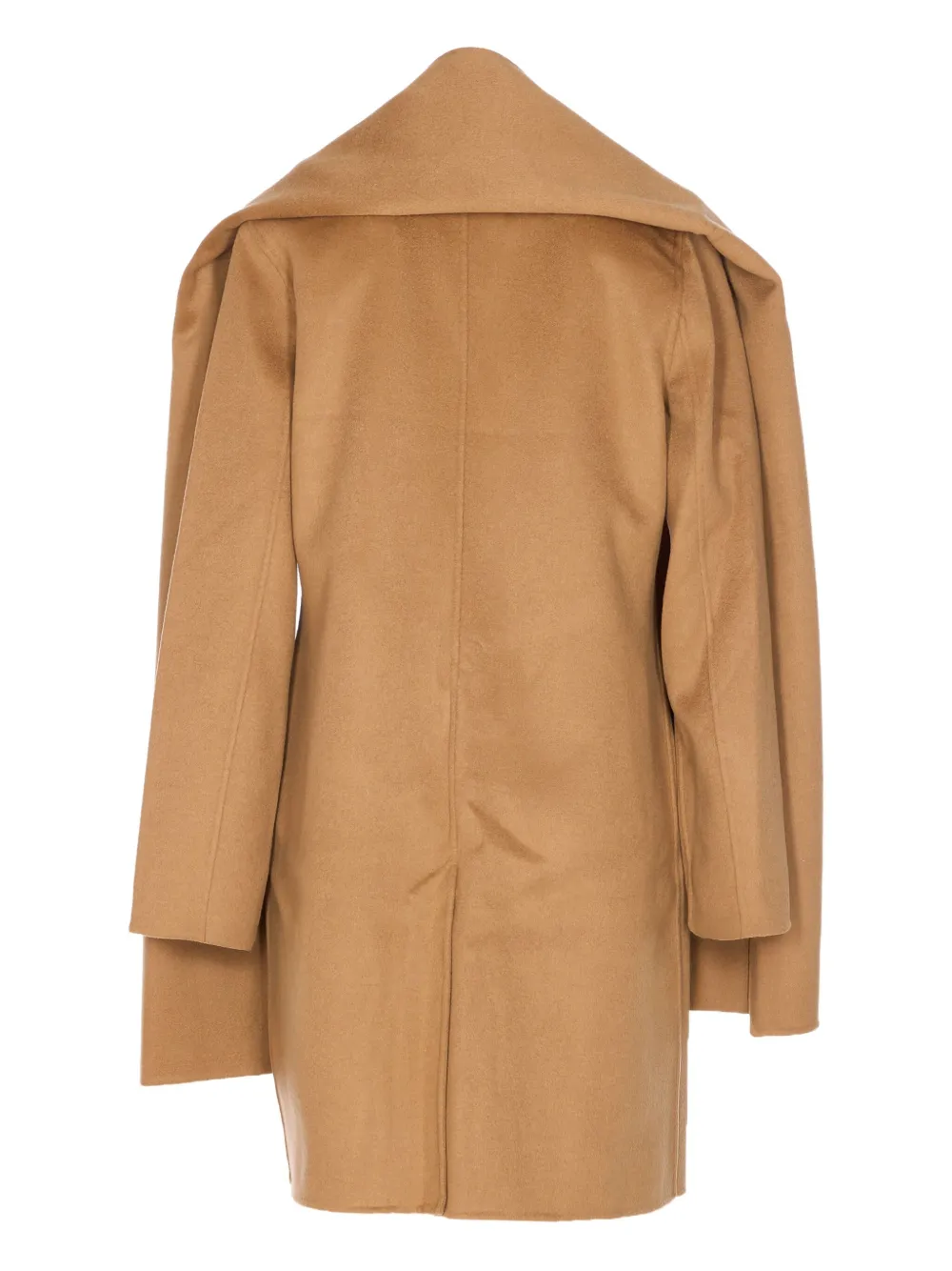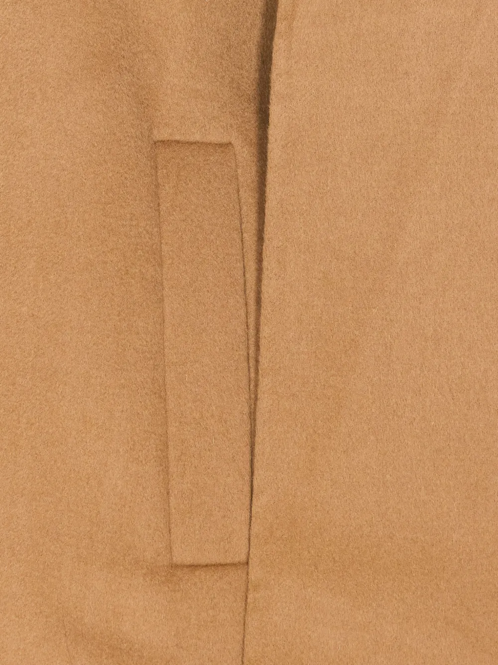 Темно-верблюжий цвет, застежка на пуговицы, лацканы с вырезом, прорезные карманы, заниженная линия плеч
