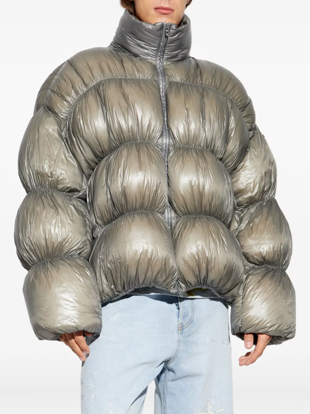 Серый стеганый дизайн, нашивка с логотипом, высокий воротник, застежка на молнии спереди