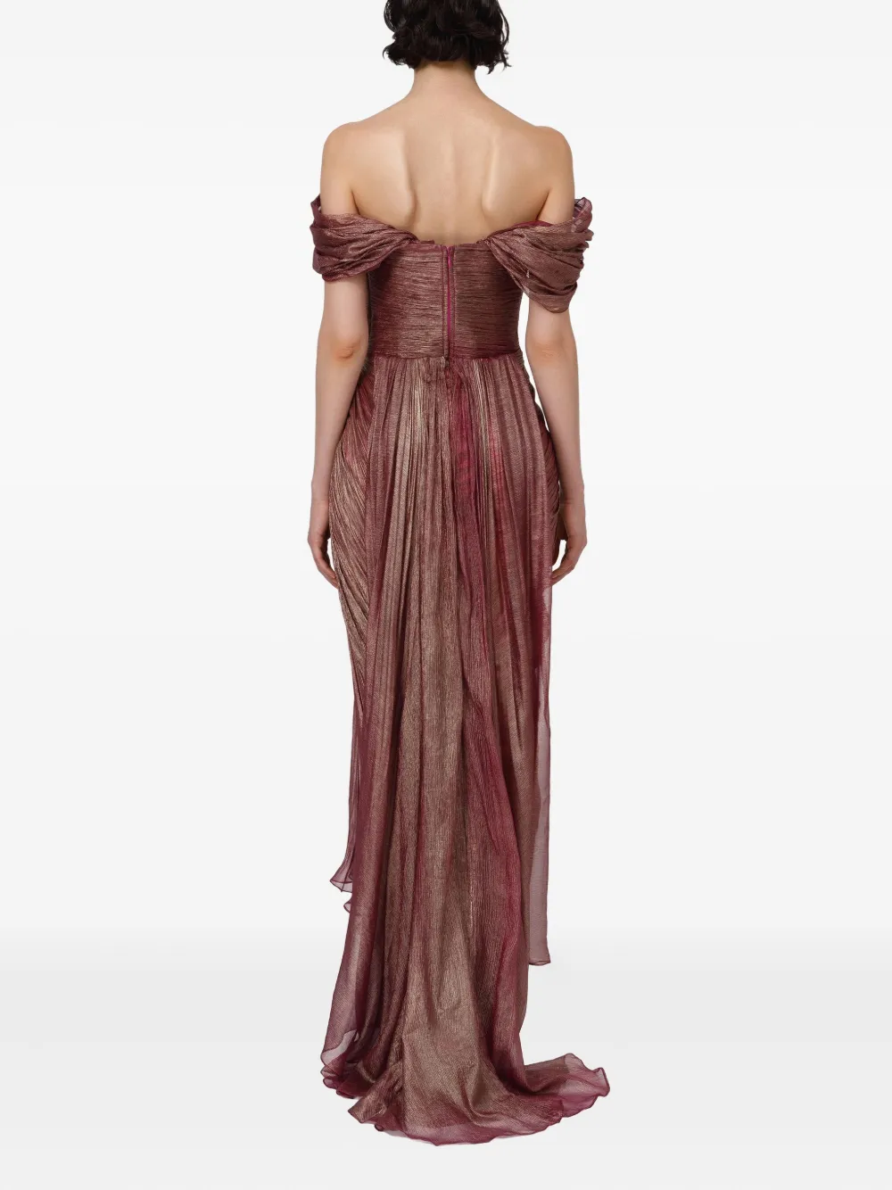 Красный шелк металлический эффект открытые плечи воротник с драпировкой плиссированная юбка асимметричный подол