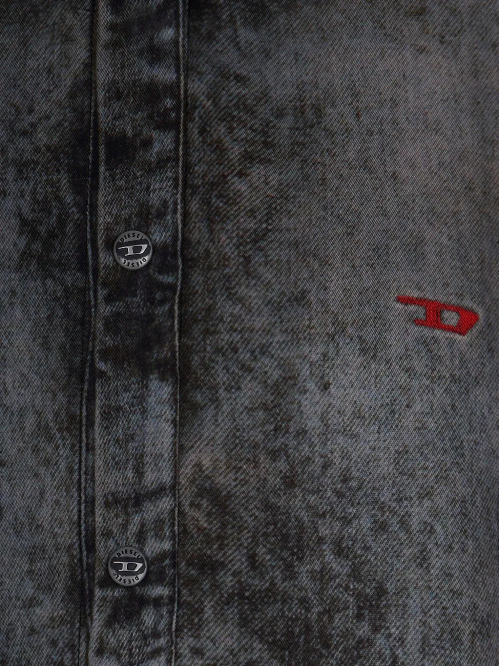 Черная джинсовая рубашка с эффектом кислотной стирки, запахом, застежкой на пуговицы спереди, длинными рукавами, асимметричным подолом и вышитым логотипом