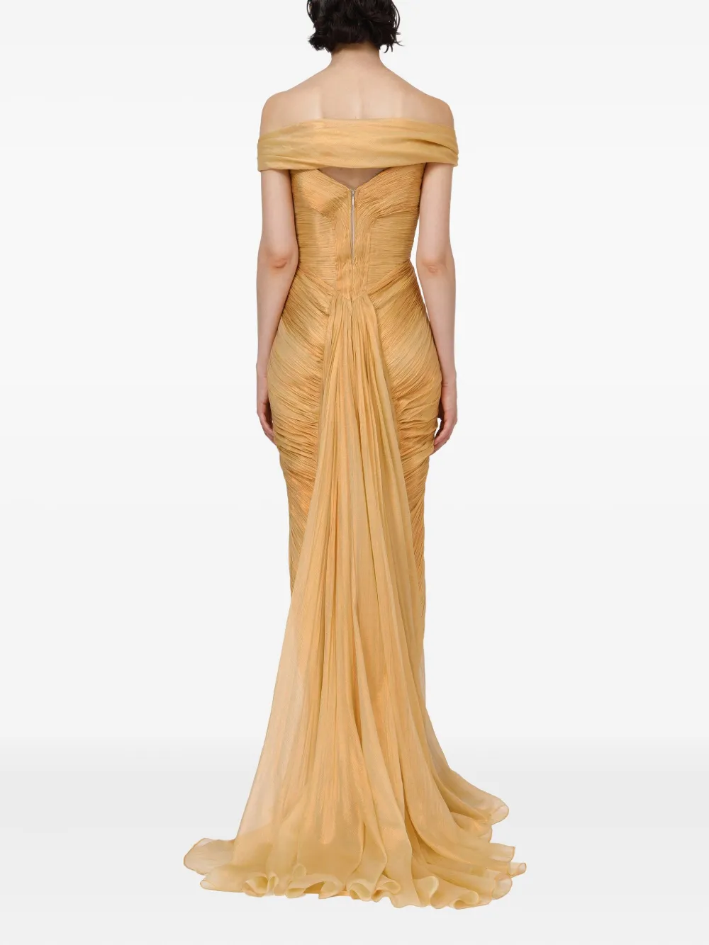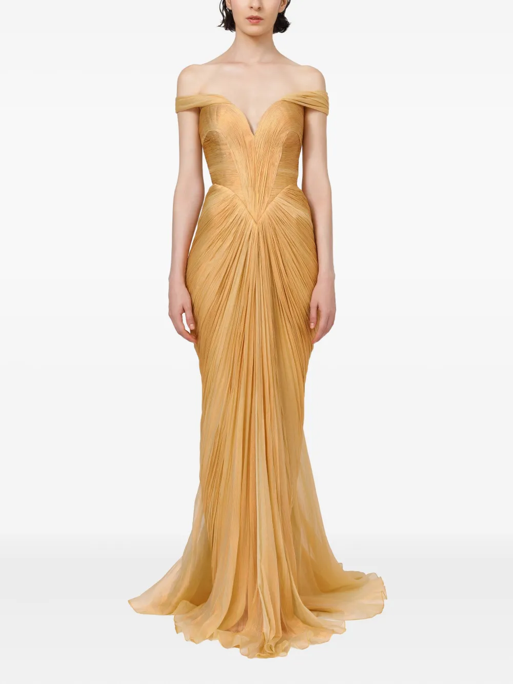 Желтое шелковое платье с открытыми плечами плиссированный лиф вырез "сердечко" драпированная юбка в пол