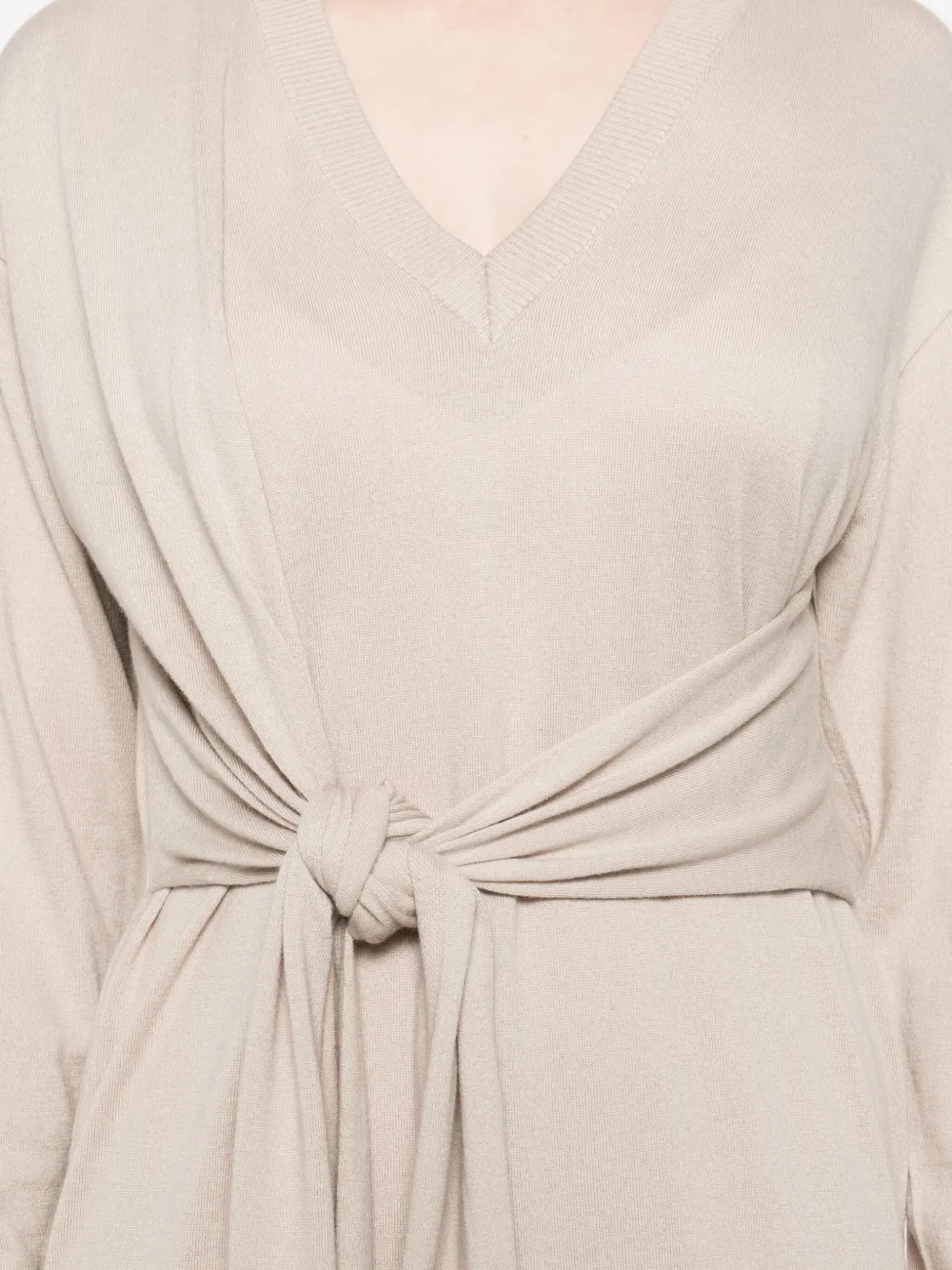 Бежевый V-образный вырез длинные рукава пояс на завязке боковые разрезы прямой подол