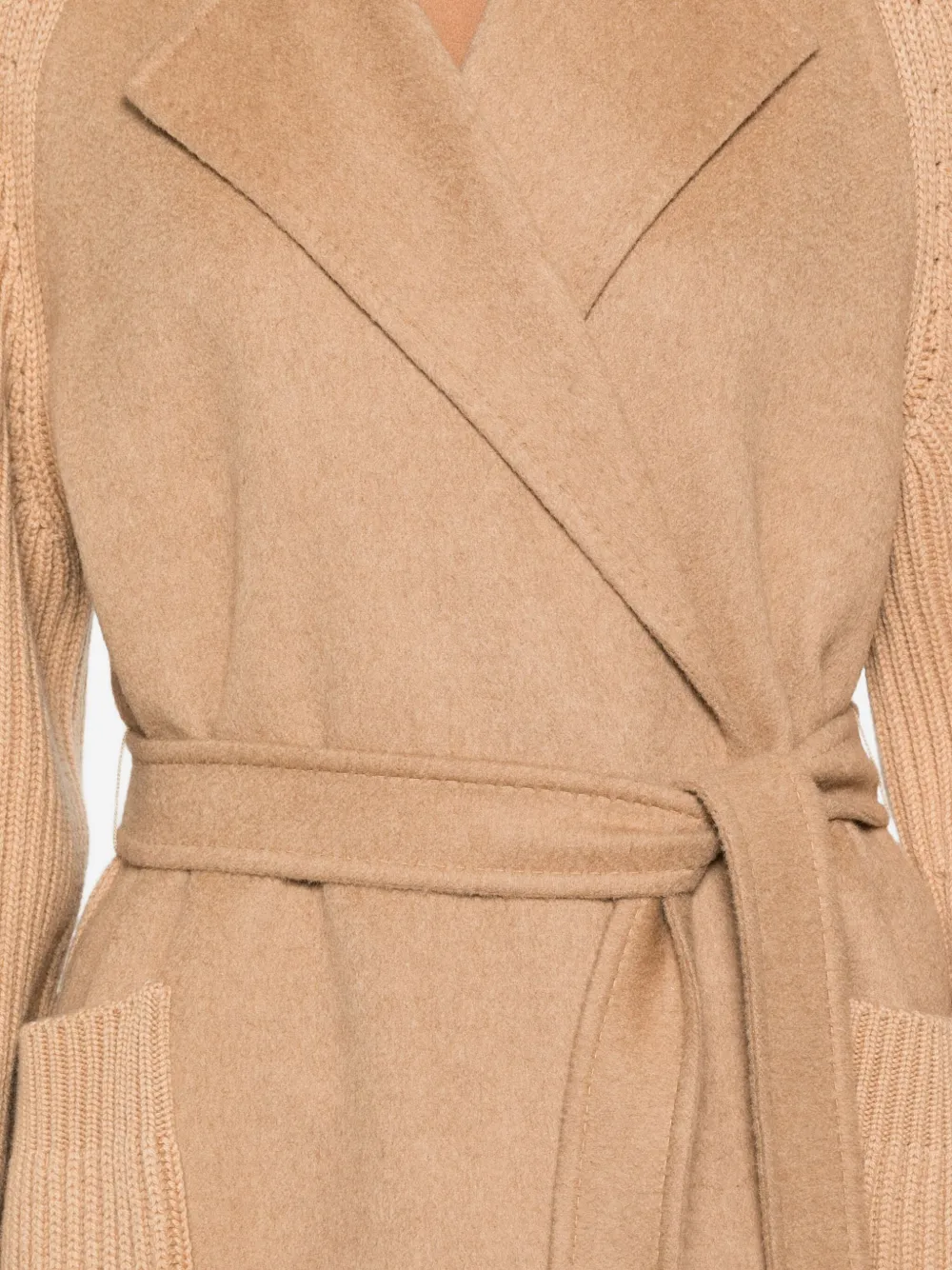 Верблюжий коричневый цвет лацканы с вырезом длинные рукава регулируемый пояс накладные карманы по бокам