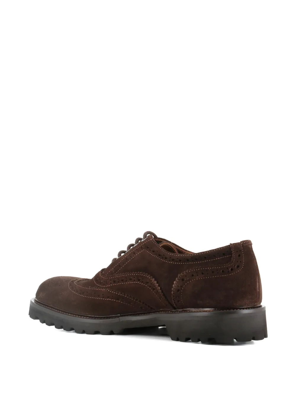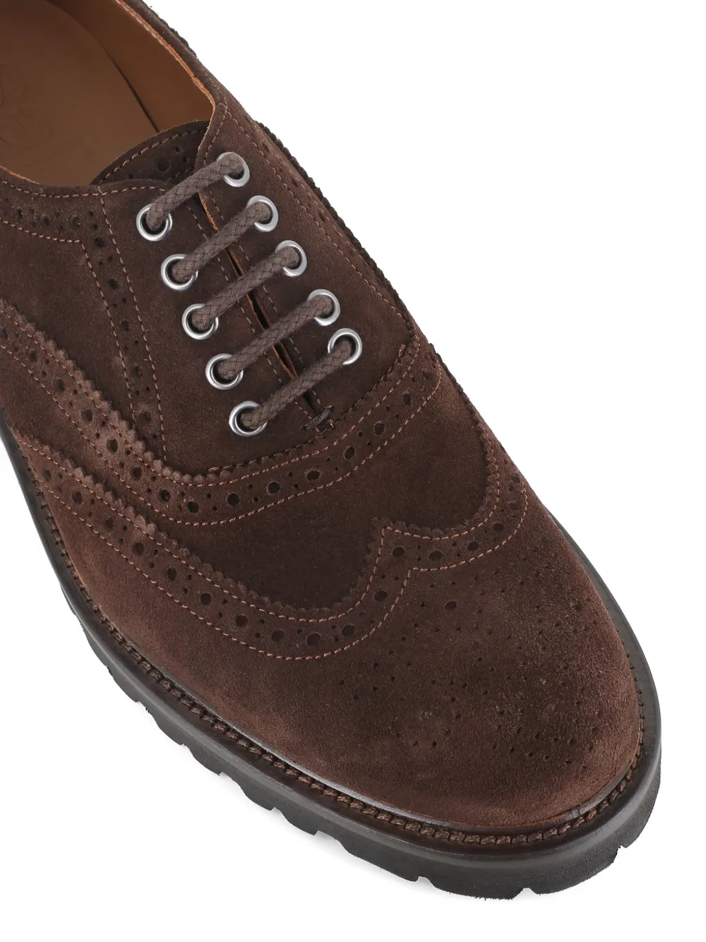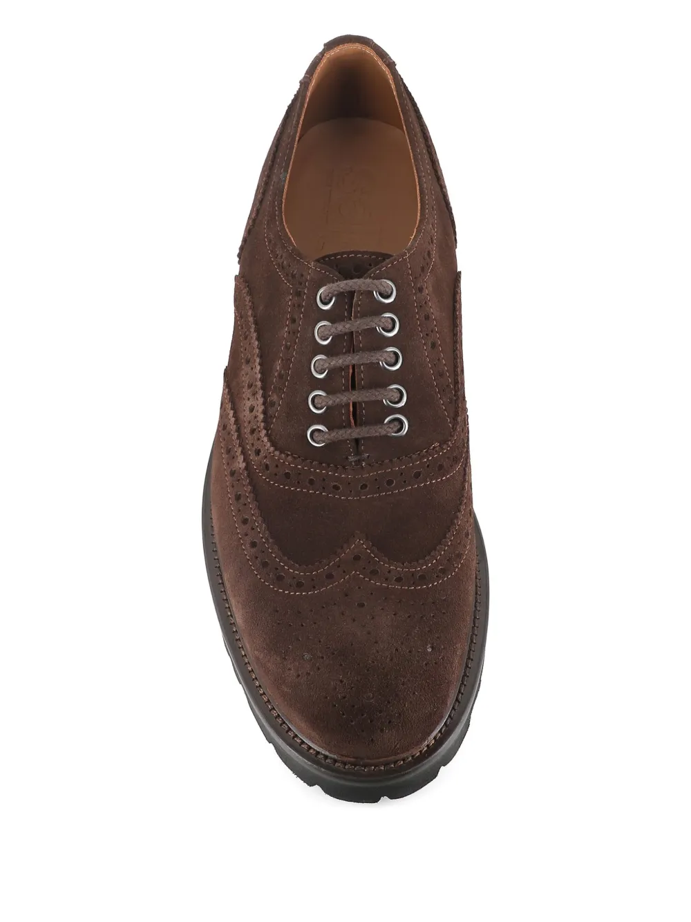 Верх из темно-коричневой замши, шнуровка, перфорированные детали, резиновая подошва