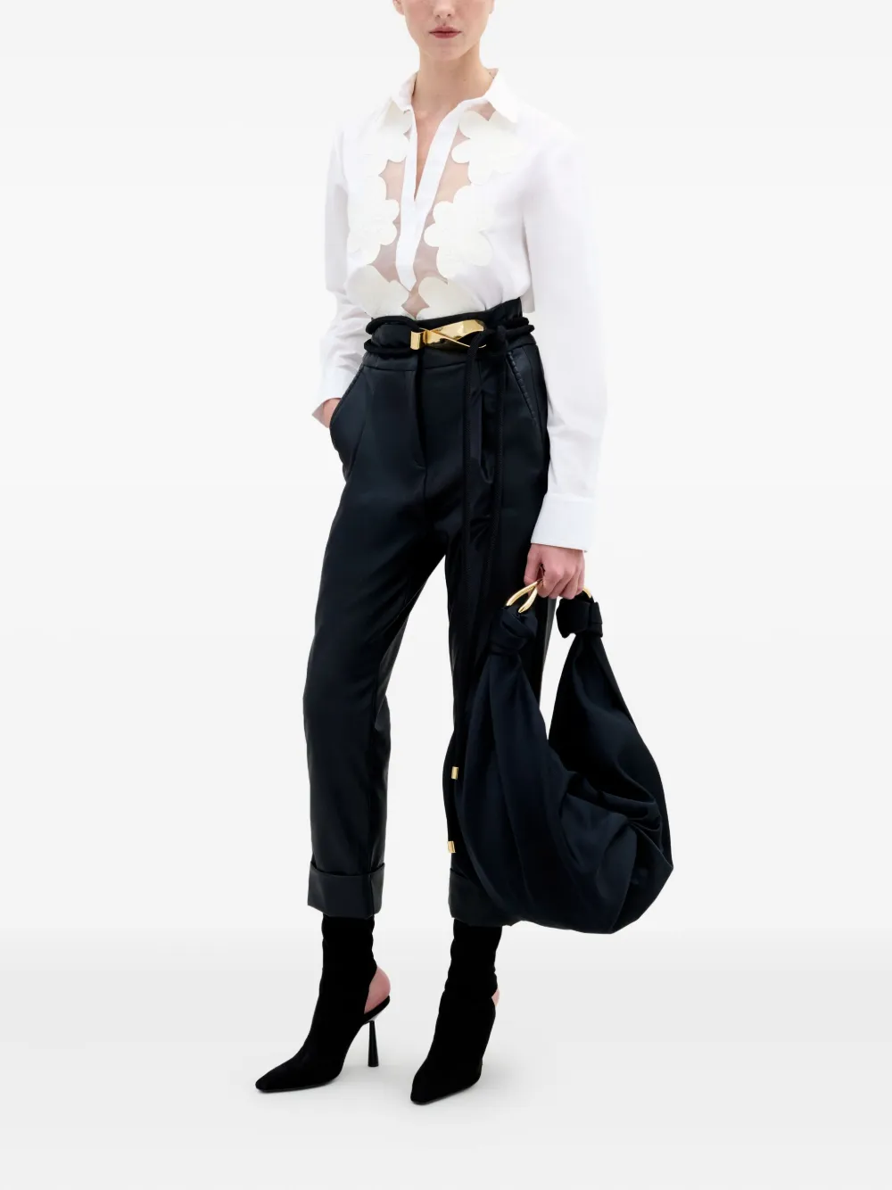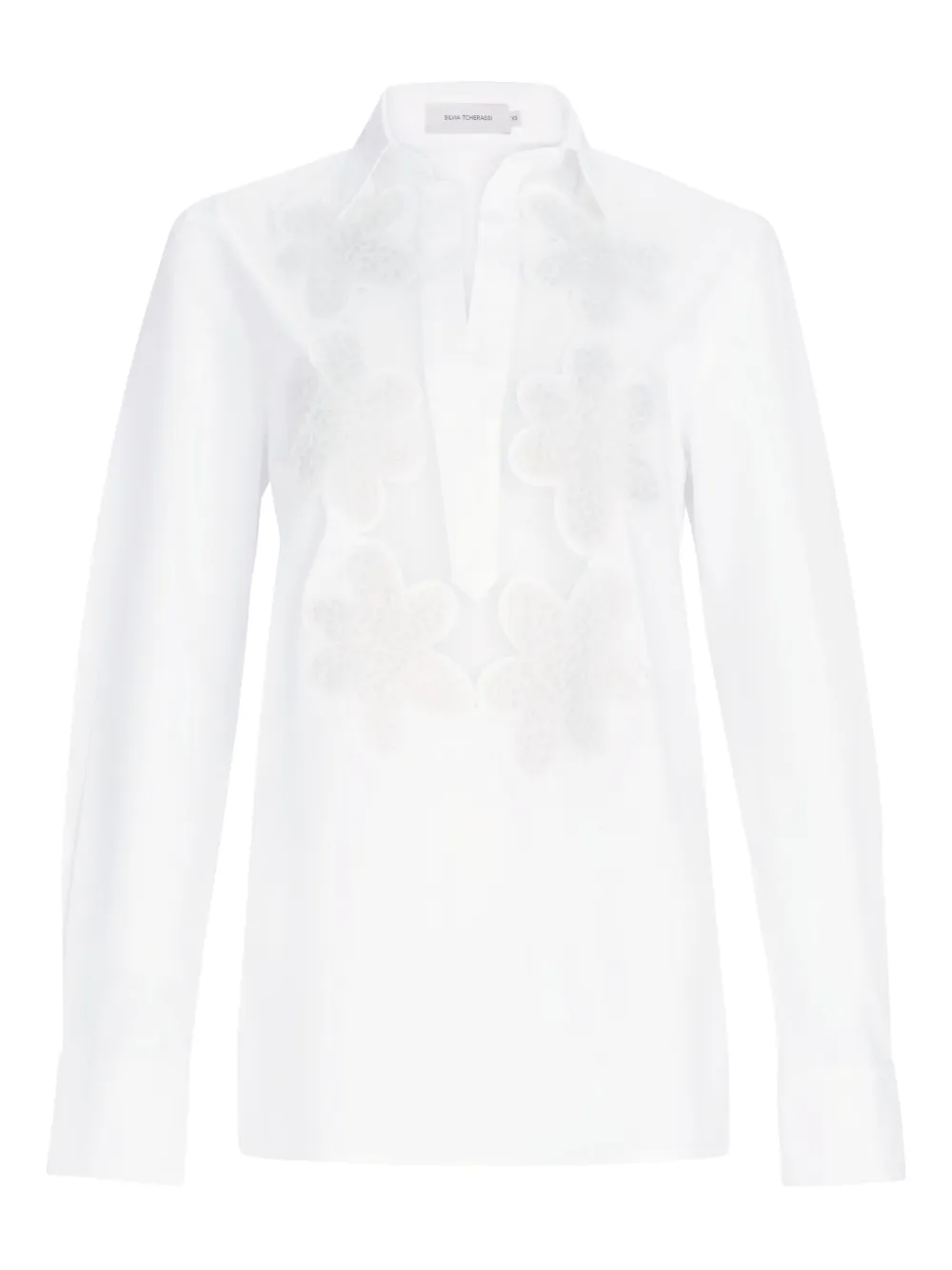 Белый хлопок длинные рукава декор в виде цветов V-образный вырез