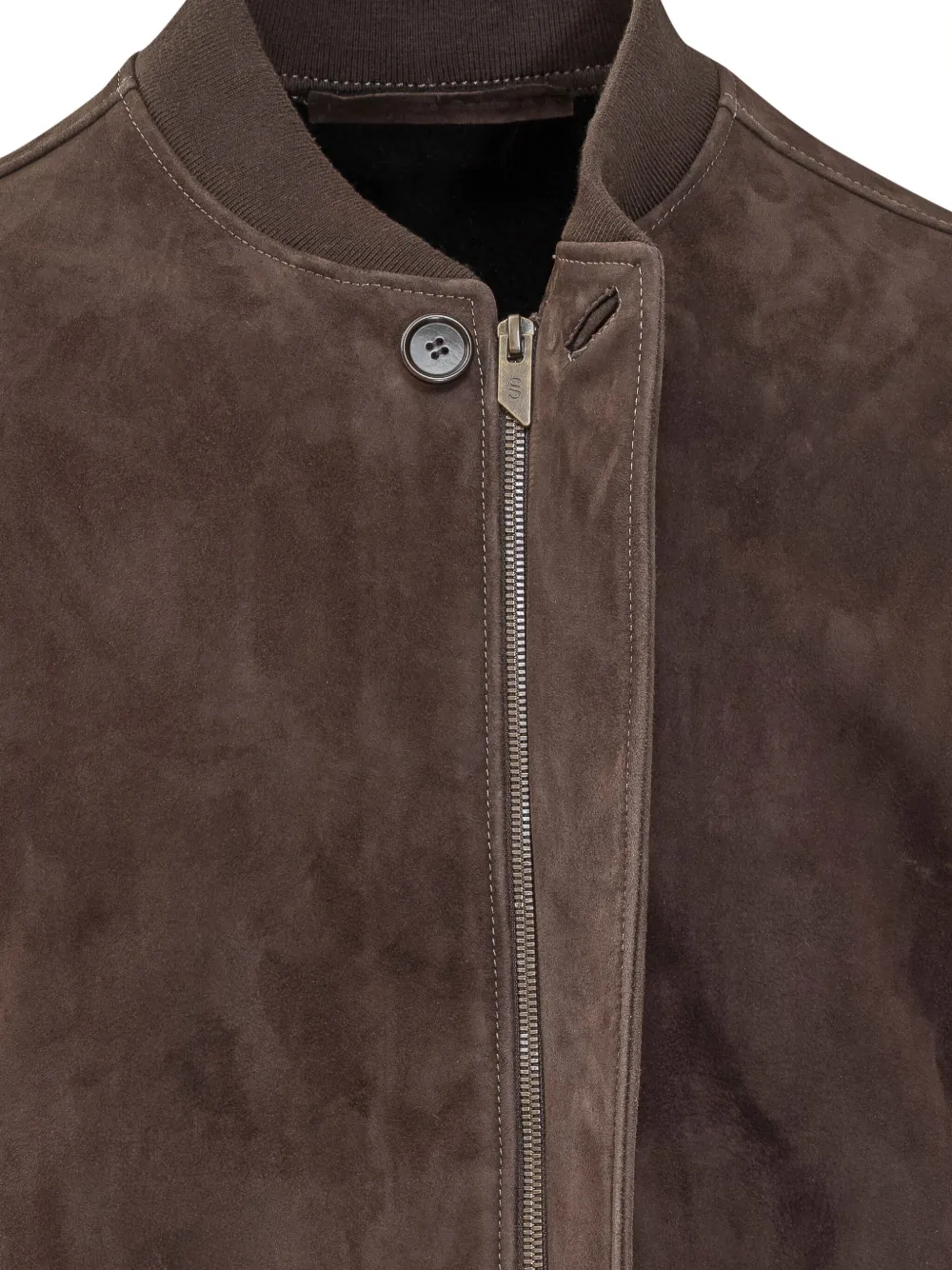 Темно-коричневая замша, кожаная молния, застежка на молнию, ребристые манжеты, прорезные карманы, застежка на пуговицы