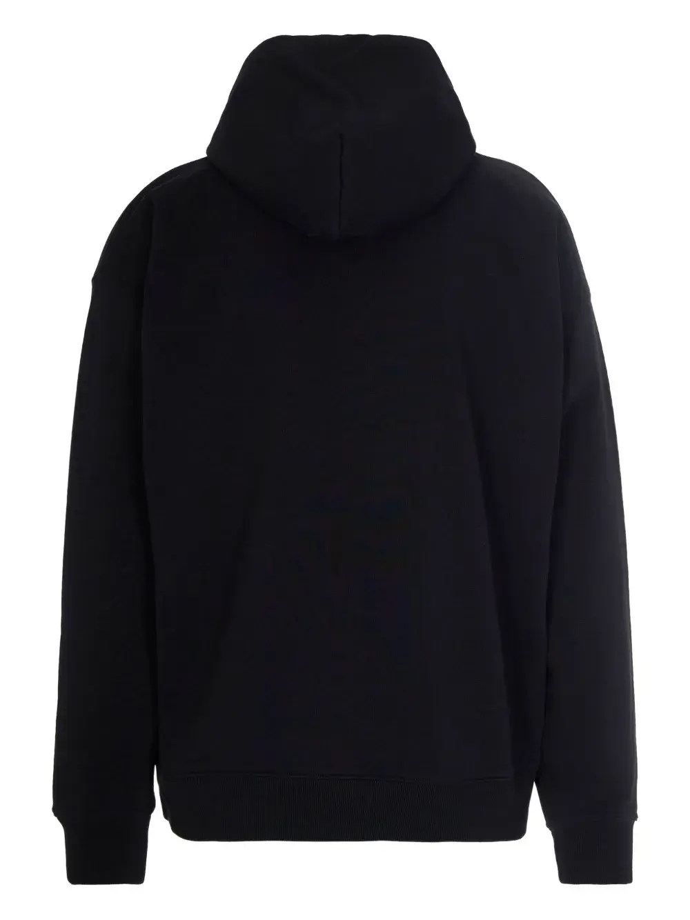 Черная хлопковая ткань, принт с логотипом, капюшон со шнурком, карман-кенгуру, ребристые отделки