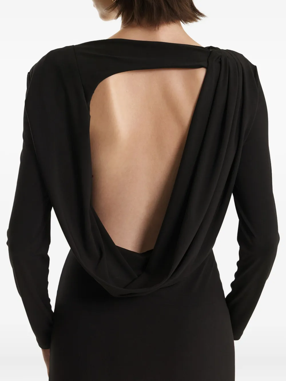 Черное драпированное мини-платье с открытой спиной и длинными рукавами