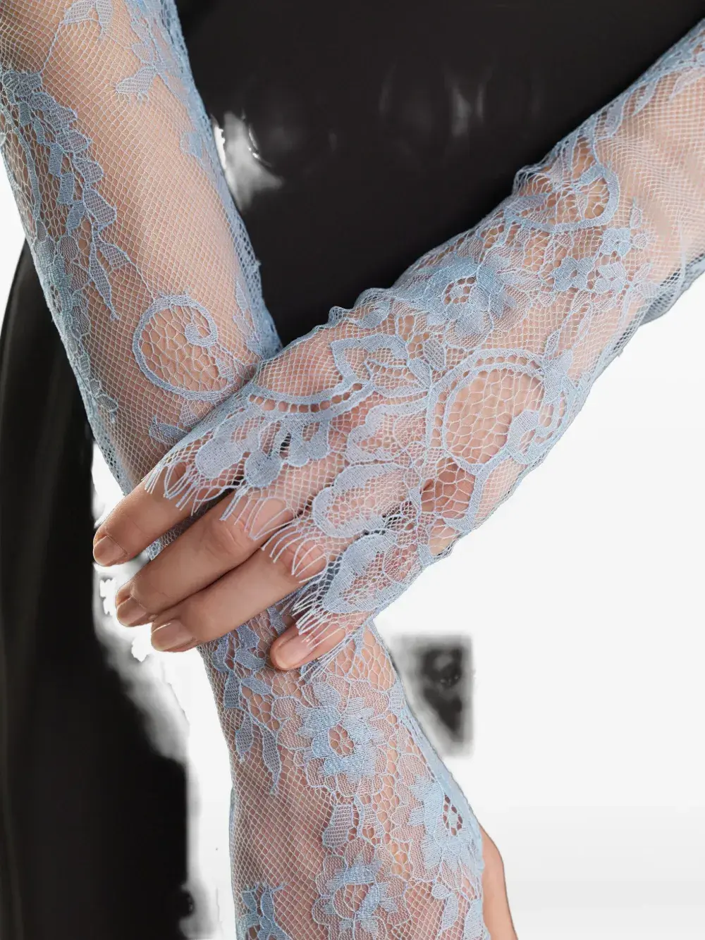 Светло-голубая длинная кружевная прозрачная ткань с цветочным узором, необработанные края, дизайн без пальцев