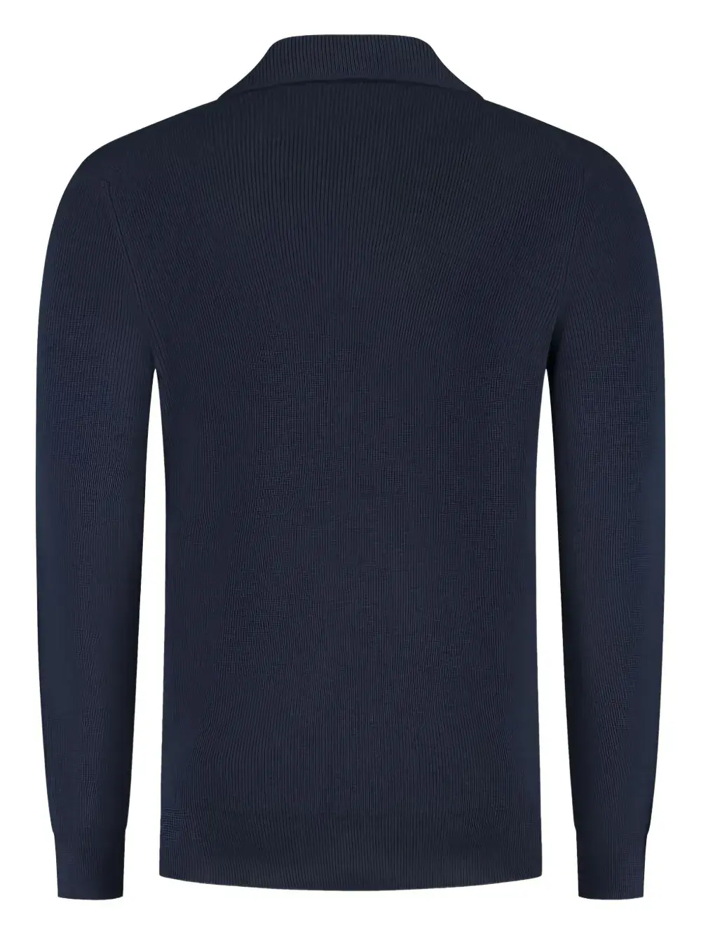 Темно-синий ребристая текстура воротник-поло длинные рукава прямой подол