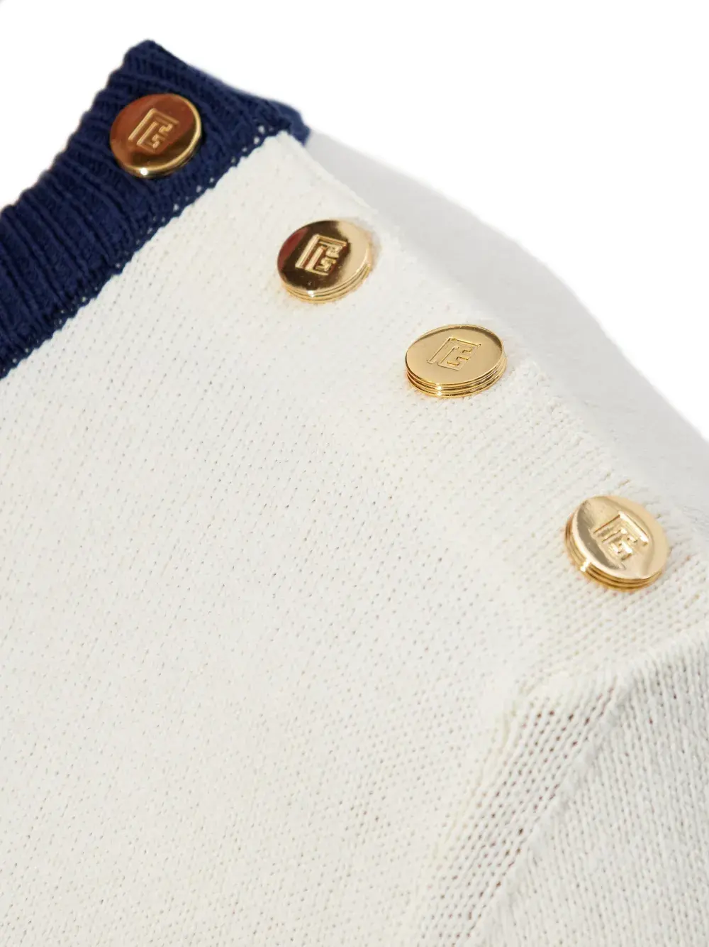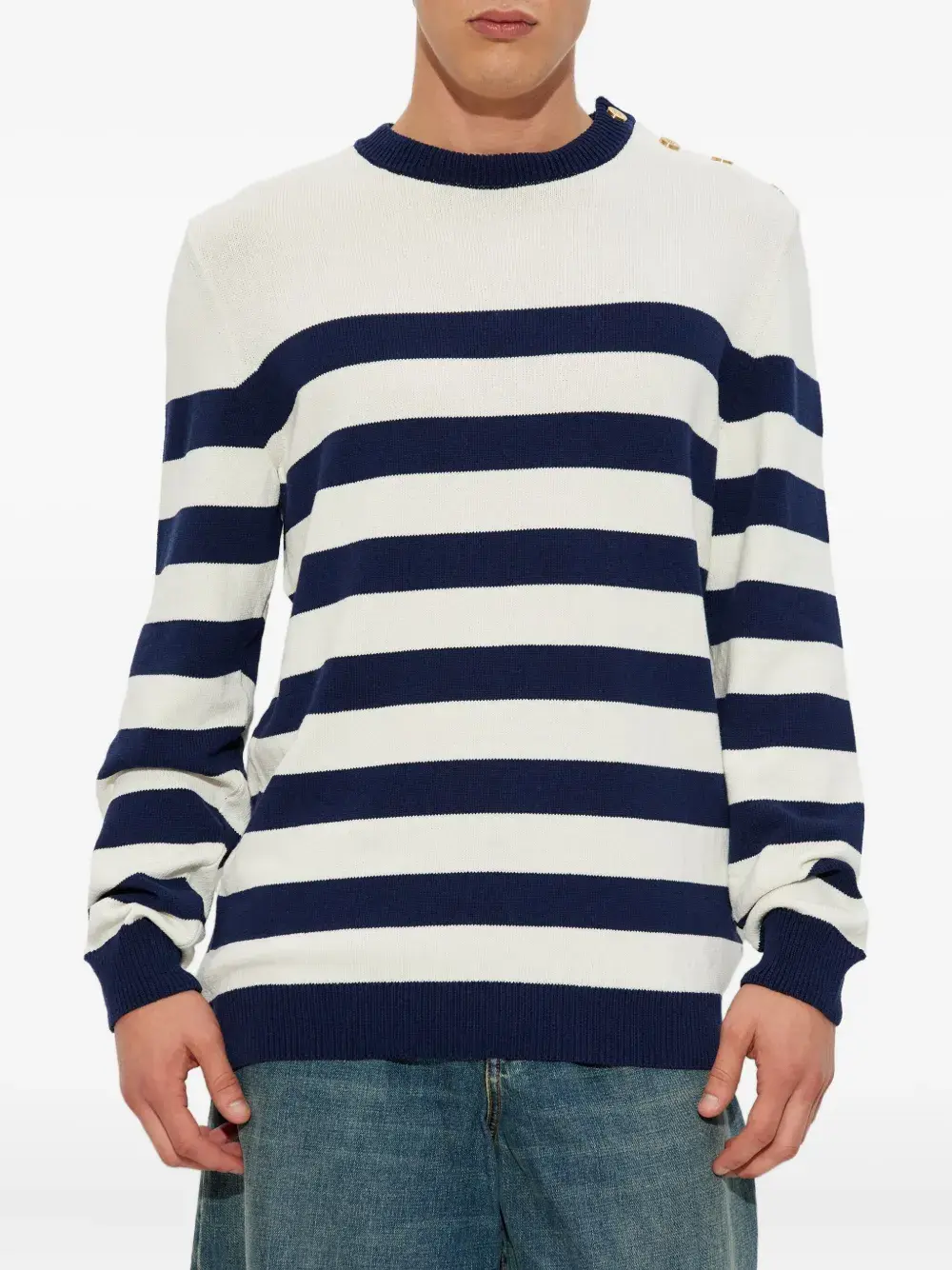 Белый и черный полосатый узор, круглый вырез, застежка на пуговицы на плече, длинные рукава, ребристый край