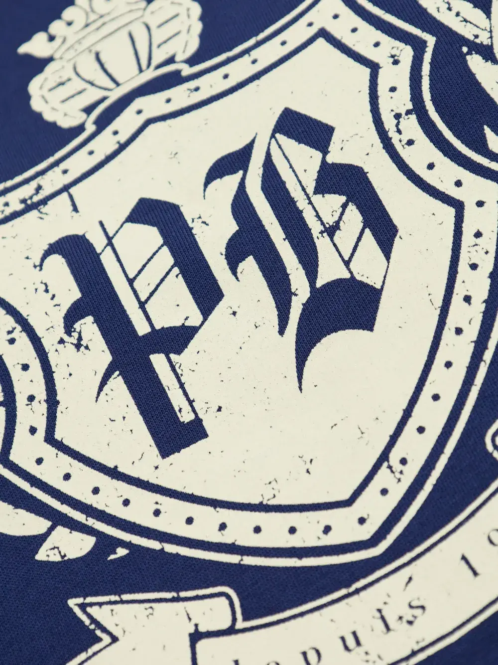 Синий цвет, графичный принт, круглый вырез, длинные рукава, ребристый низ, ребристые манжеты
