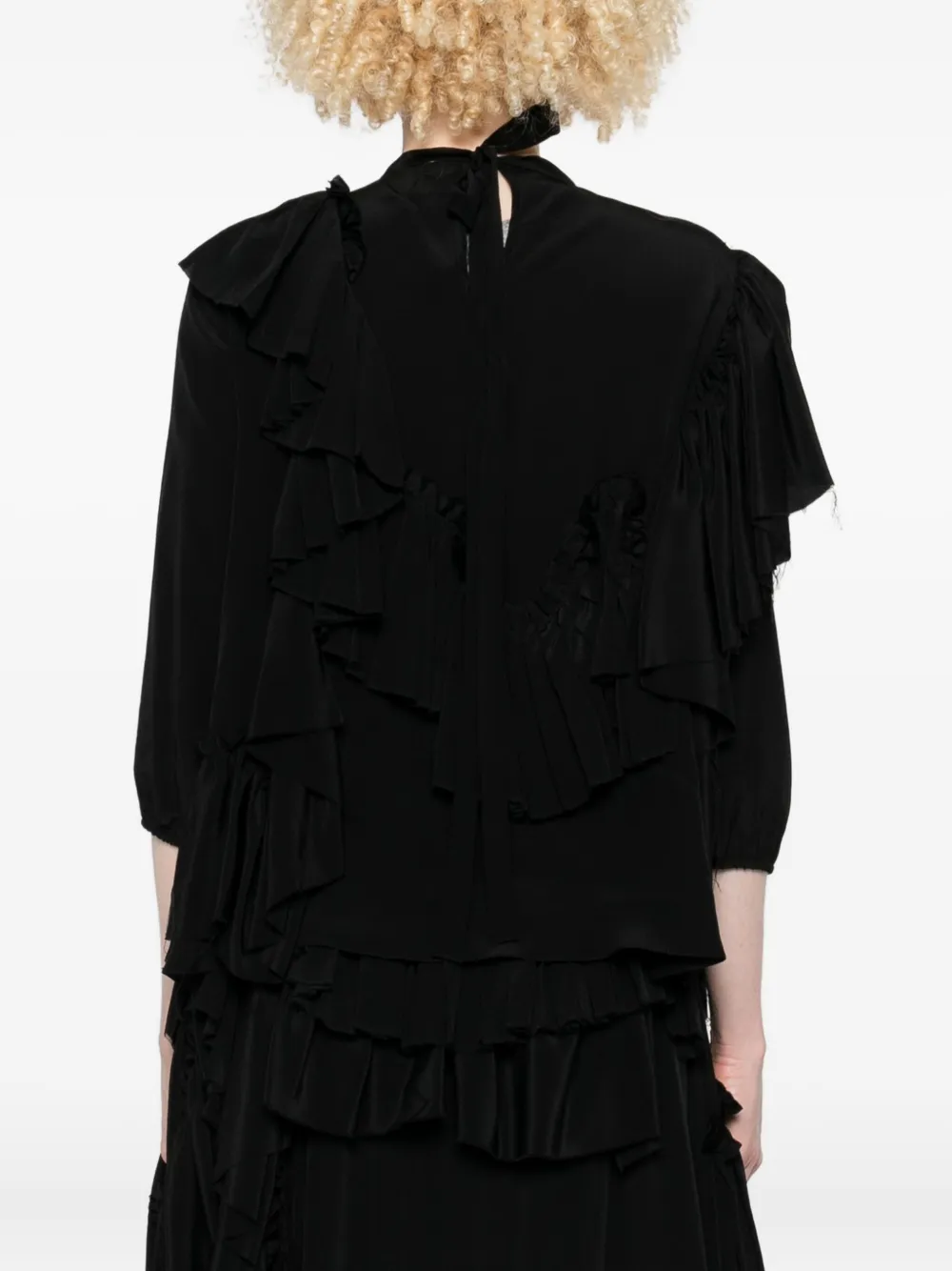 Черные оборки, асимметричный подол, круглый вырез, рукава три четверти, необработанные края