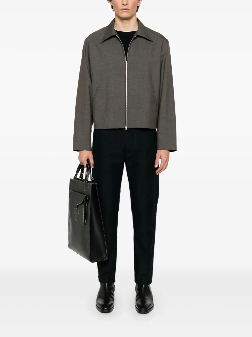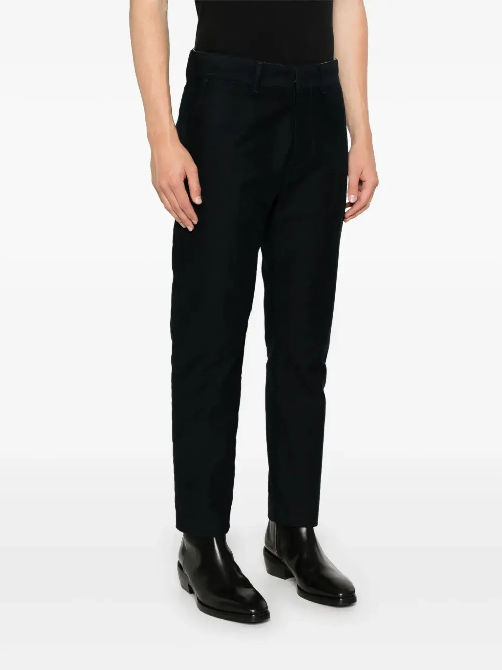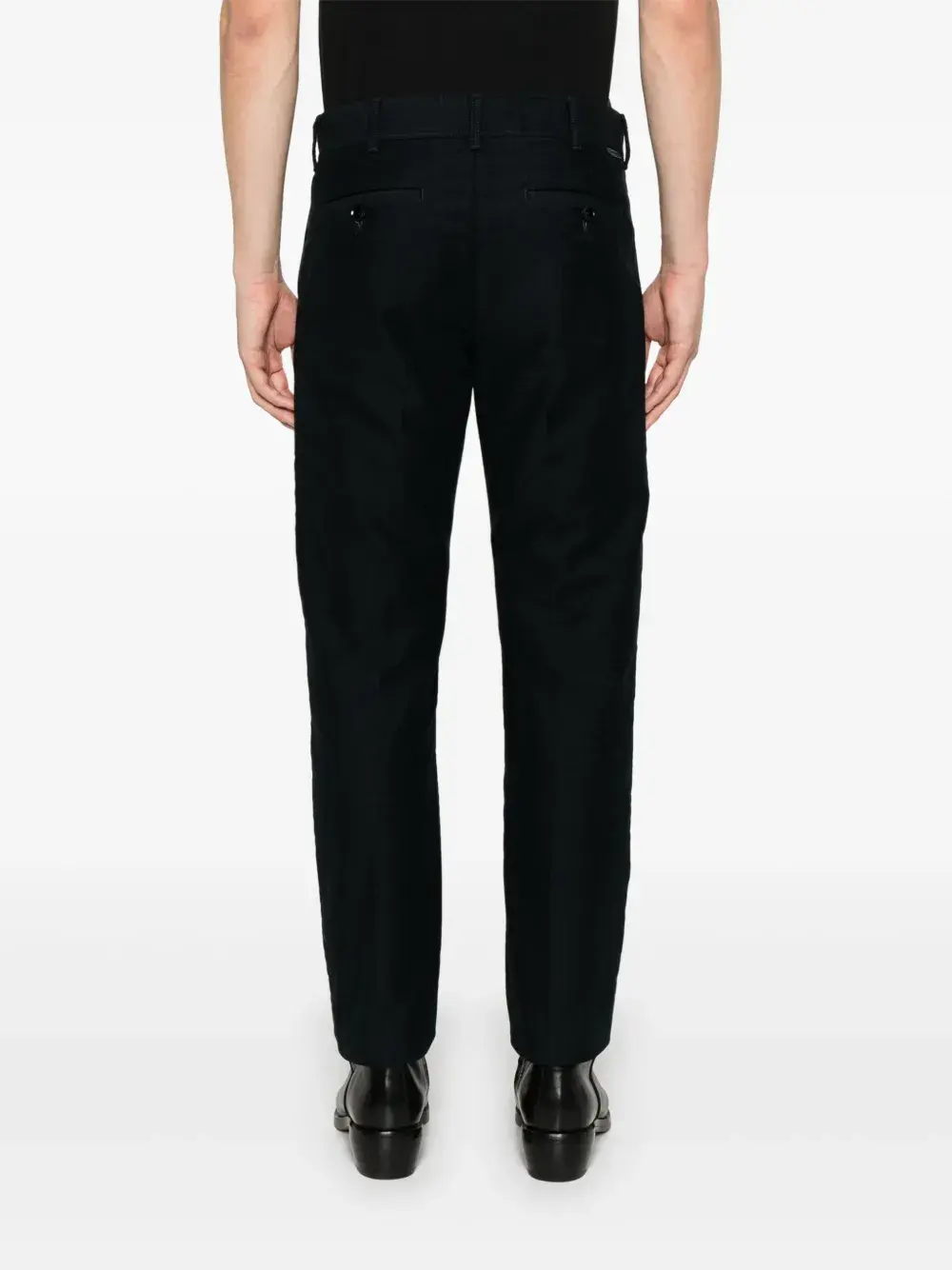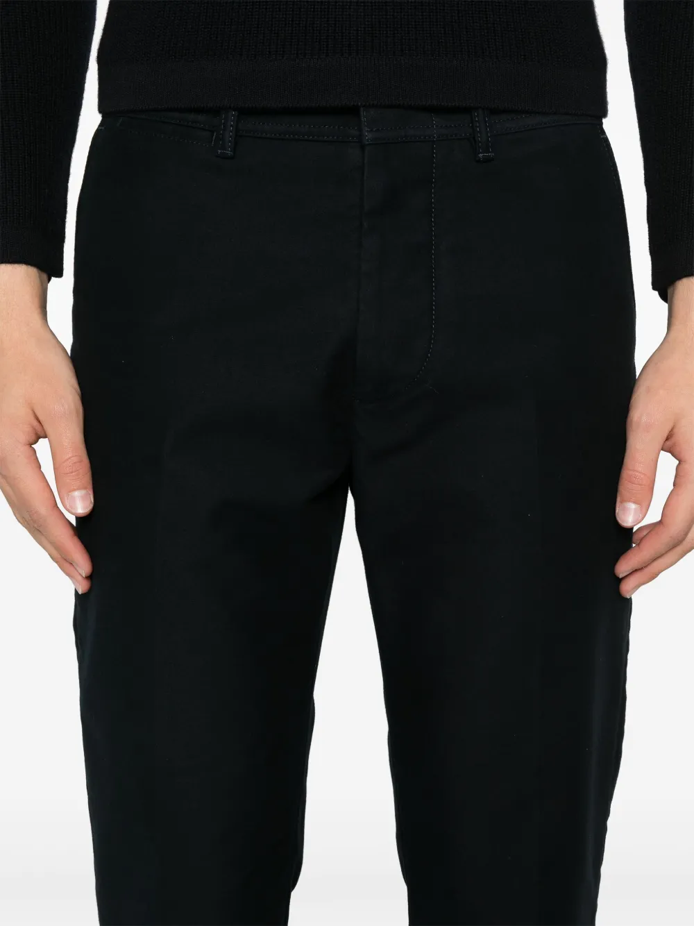 Застежка спереди на крючок и потайную молнию. Шлевки для ремня на талии. Прорезной карман спереди. Боковые косые карманы, задние прорезные карманы на пуговицах. Складка по центру спереди и сзади. Логотип нашит сзади. Прямой крой брючин. Цвет: темно-синий. 100% хлопок. Сделано в Италии.