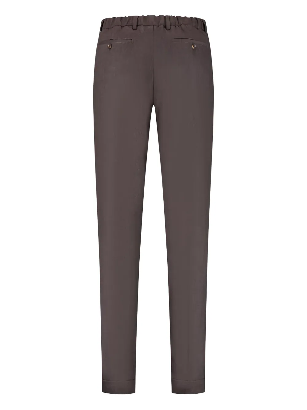 Коричневый эластичный пояс со шнурком низы с манжетами застежка на пуговицу задние прорезные карманы