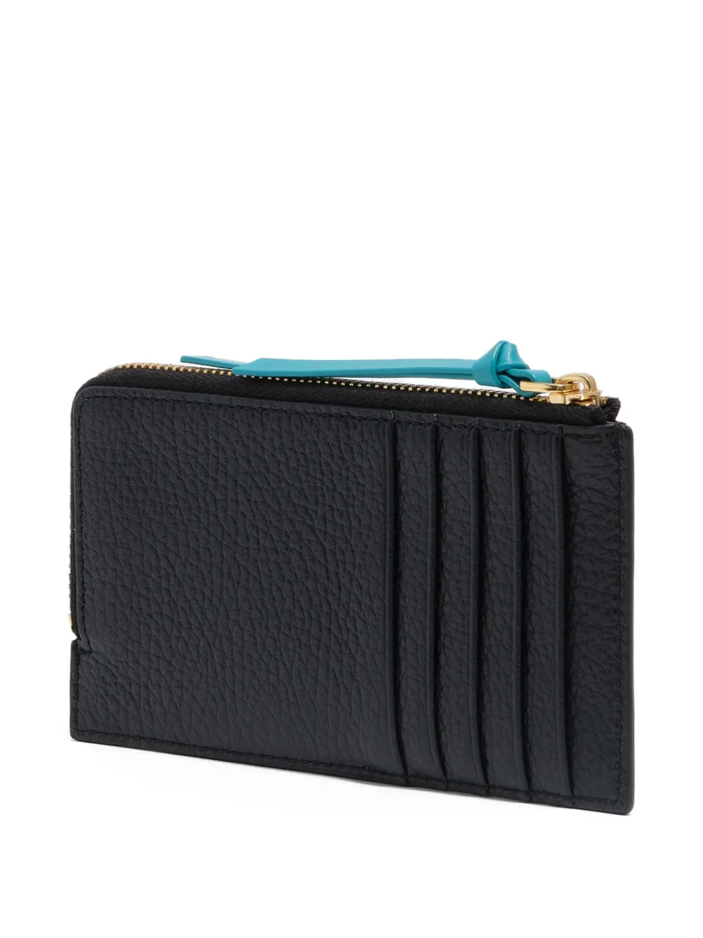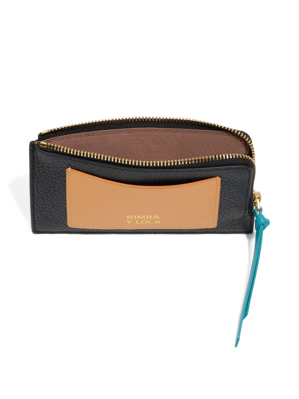 Черная кожаная конструкция, застежка-молния, оранжевая вставка, несколько слотов для карт, бирюзовый пуллер на молнии