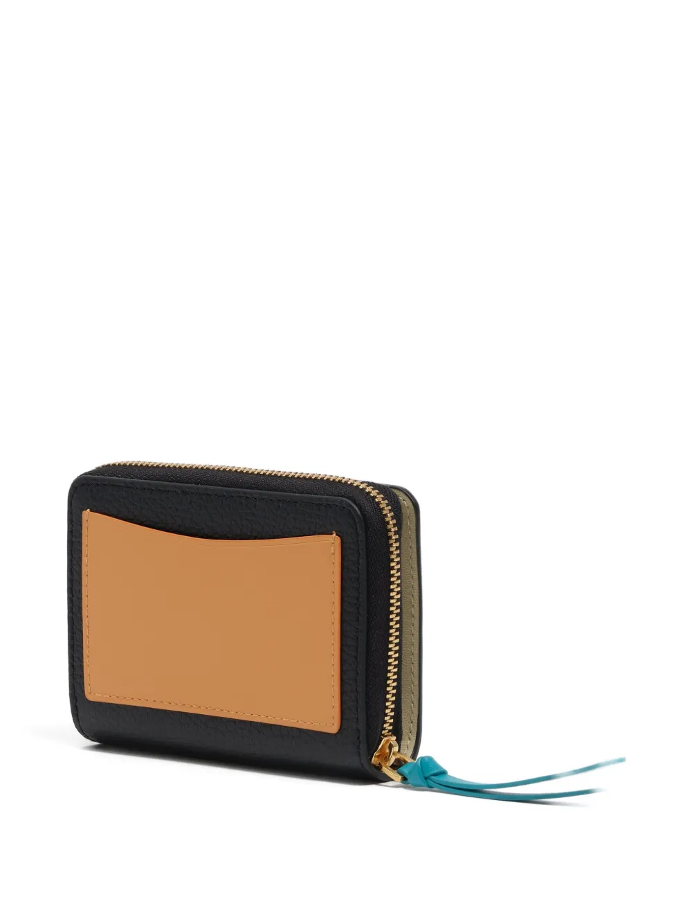 Черная кожаная конструкция, застежка-молния, золотая надпись с логотипом, бирюзовая ленточка на бегунке, внешний карман
