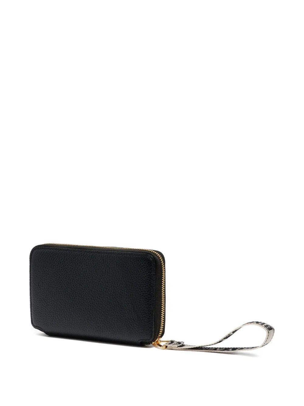 Черная кожа, застежка на молнии, тисненый логотип золотистого цвета, ремешок на запястье