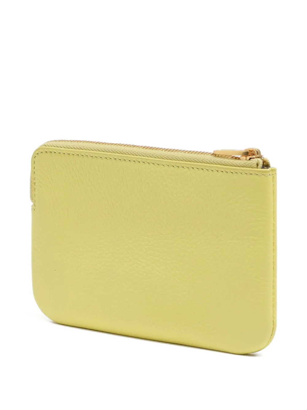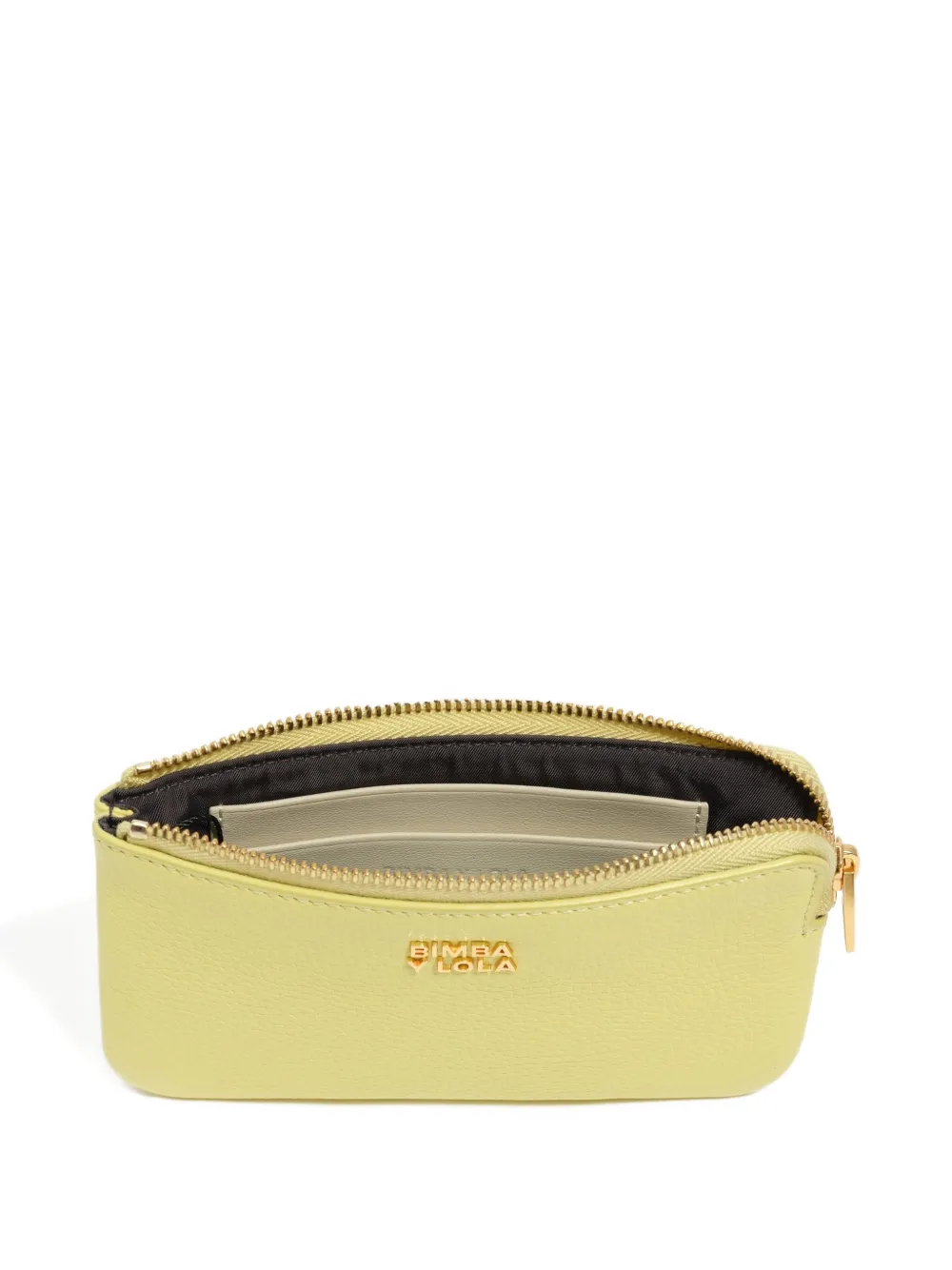 Кислотно-желтая кожа, застежка-молния, логотип золотистого цвета, плоская форма