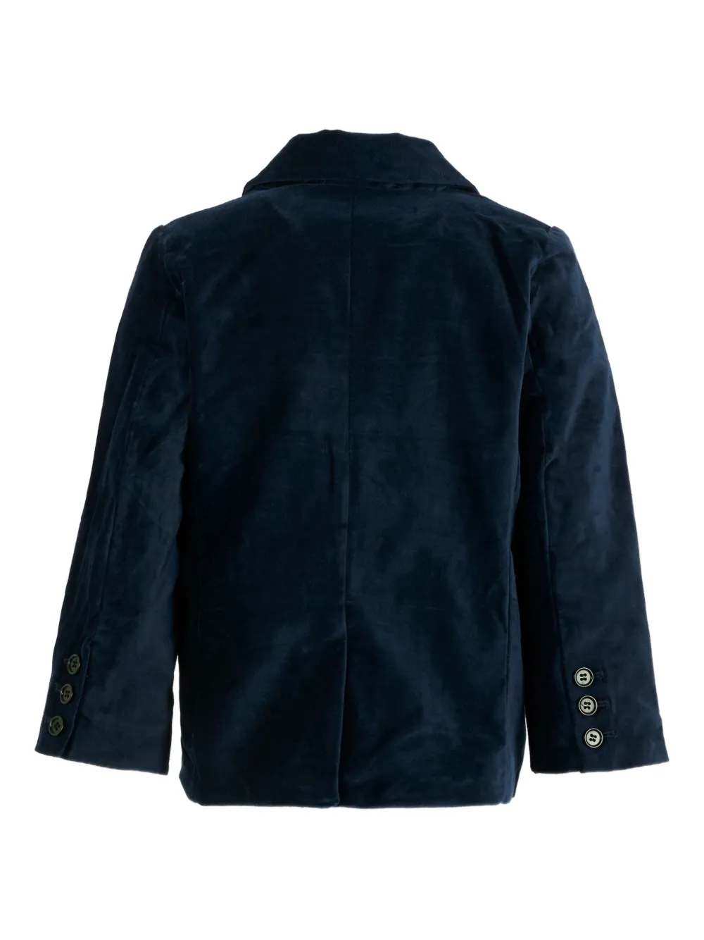 Синий бархат текстурированный, застежка на две пуговицы, лацканы с вырезом, прорезные карманы, длинные рукава