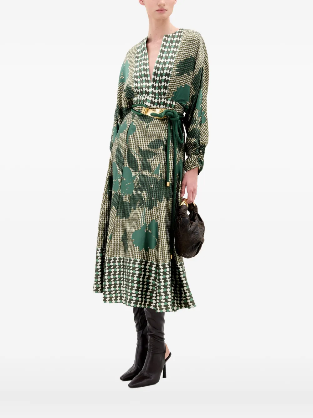 Зеленый смесь шелка абстрактный цветочный принт V-образный вырез длинные рукава сборки на манжетах