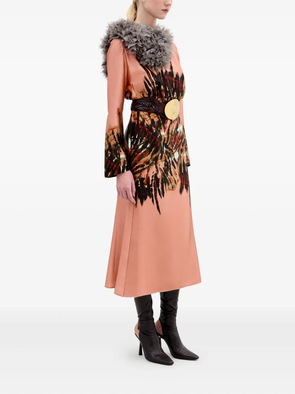 Персиковый смесь шелка абстрактный принт длинные рукава-клеш съемный пояс воротник с вырезом-каплей