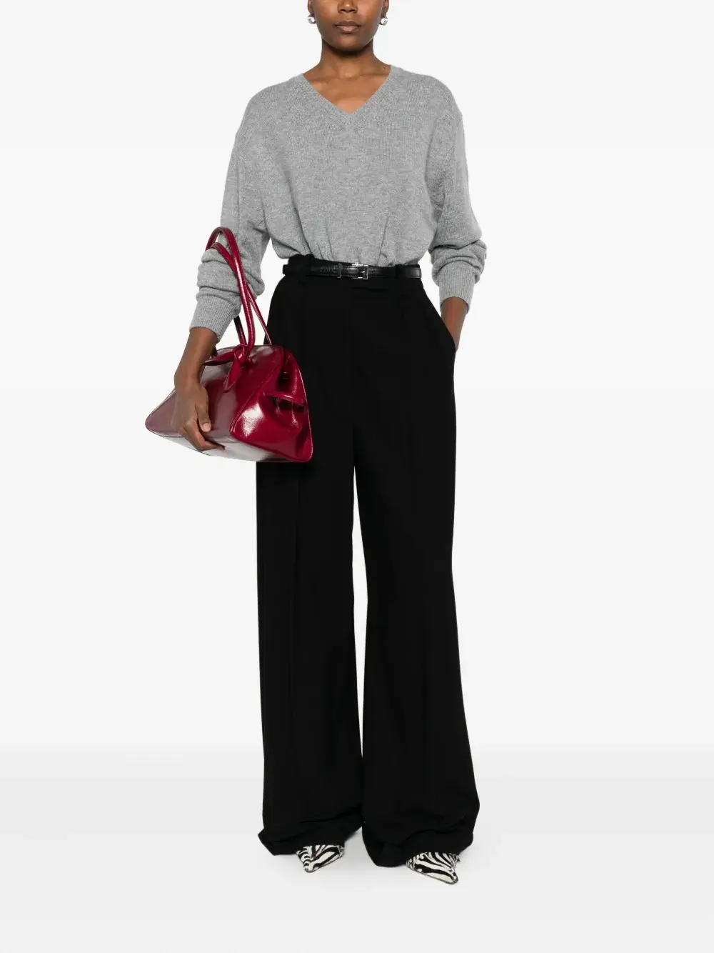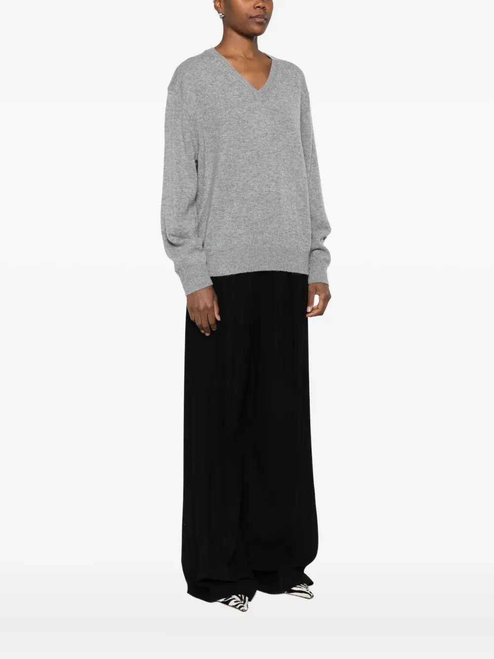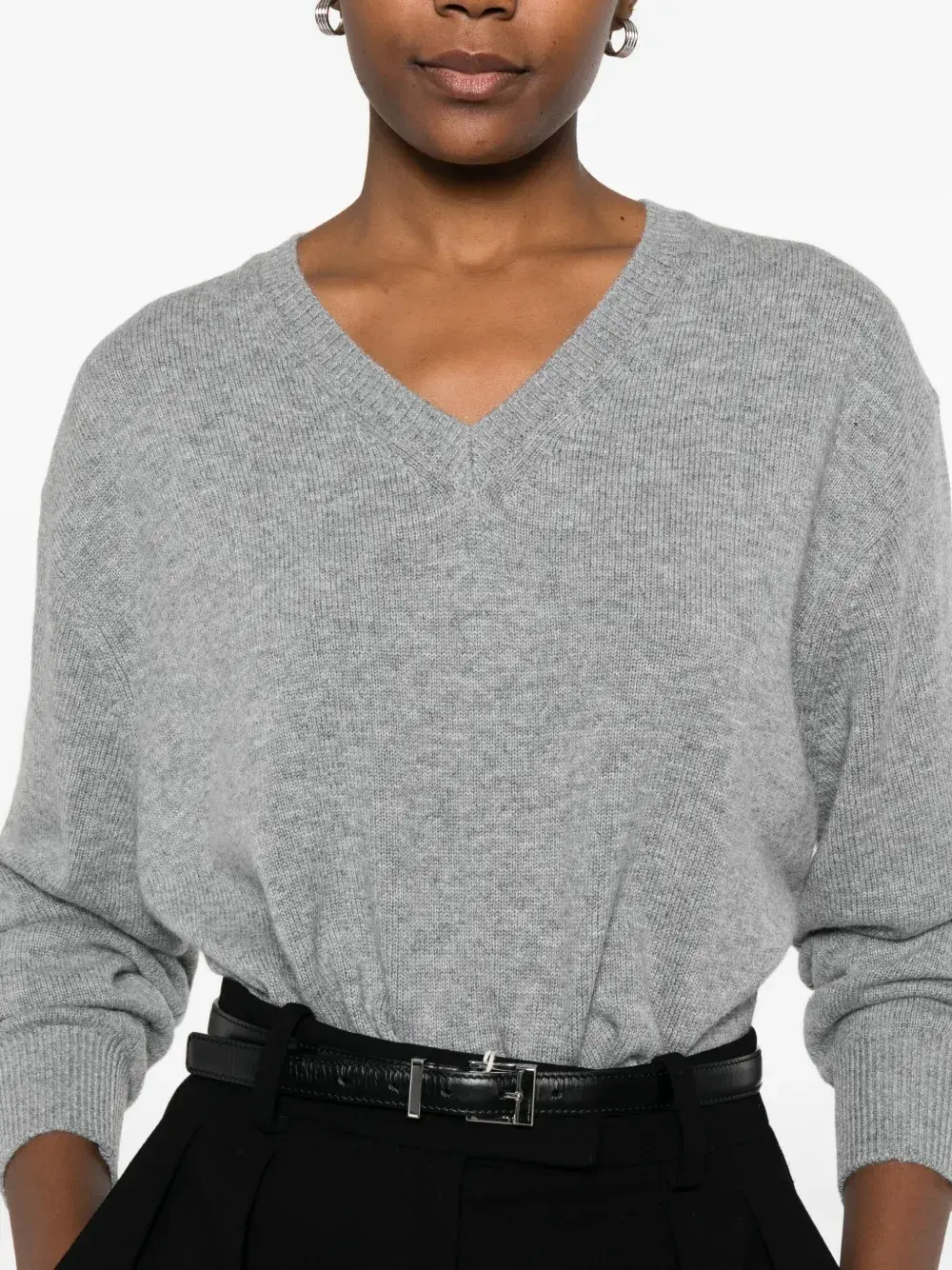 Серый V-образный вырез длинные рукава рубчатые манжеты и низ трикотаж