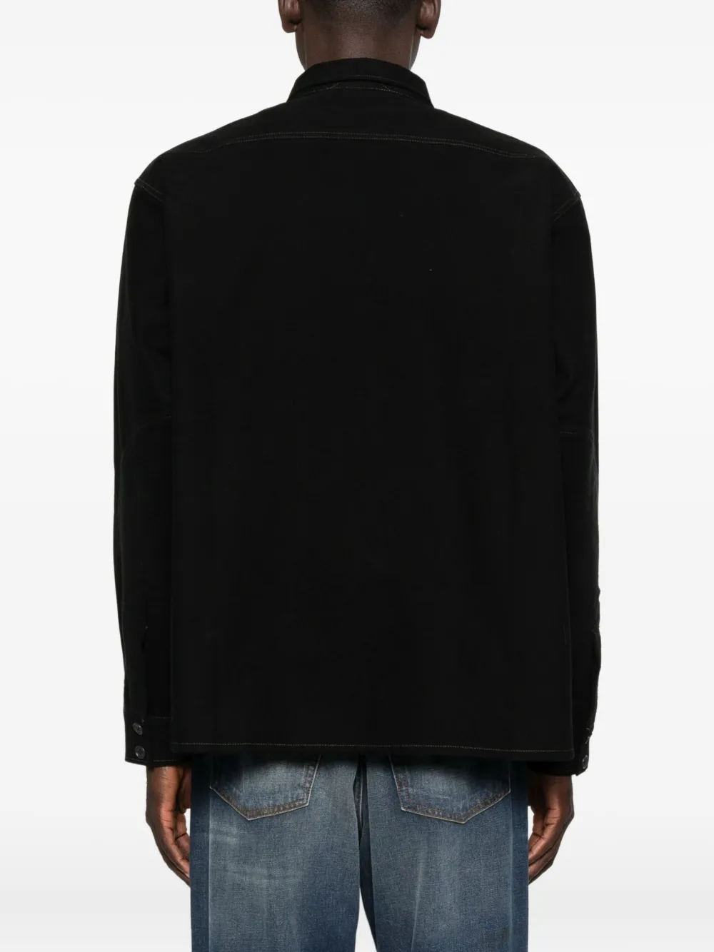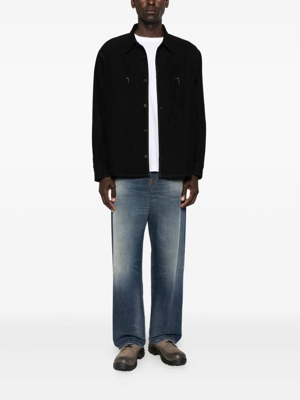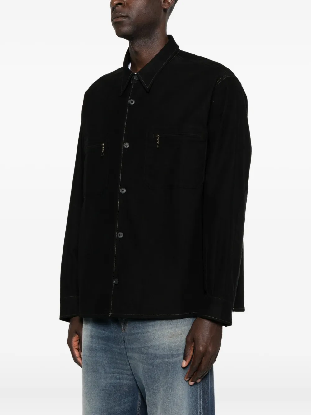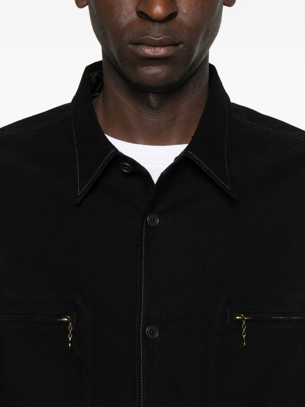 Черный отложной воротник застежка на пуговицах спереди длинные рукава два нагрудных кармана на молнии