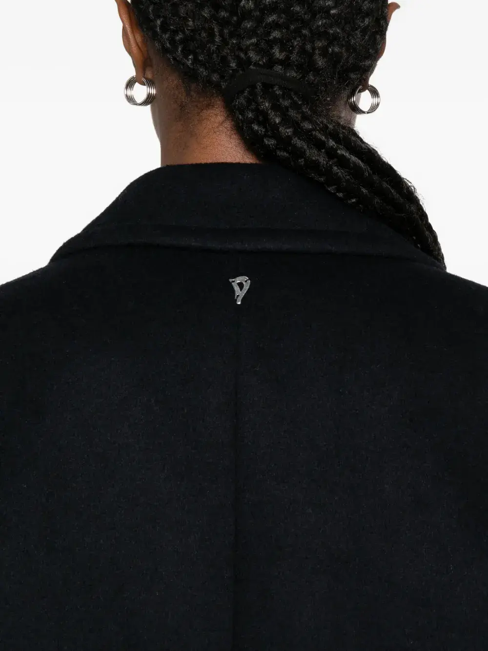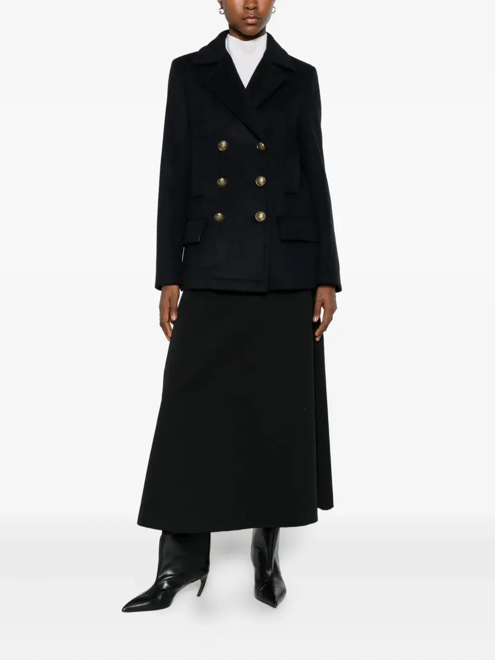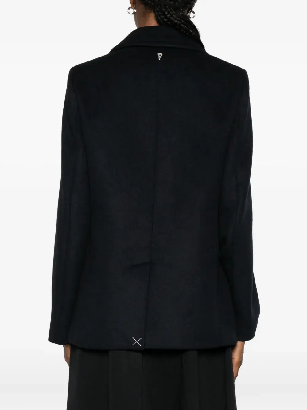 Темно-синий двубортная застежка на пуговицы передние карманы с клапанами боковые прорезные карманы лацканы с вырезом длинные рукава