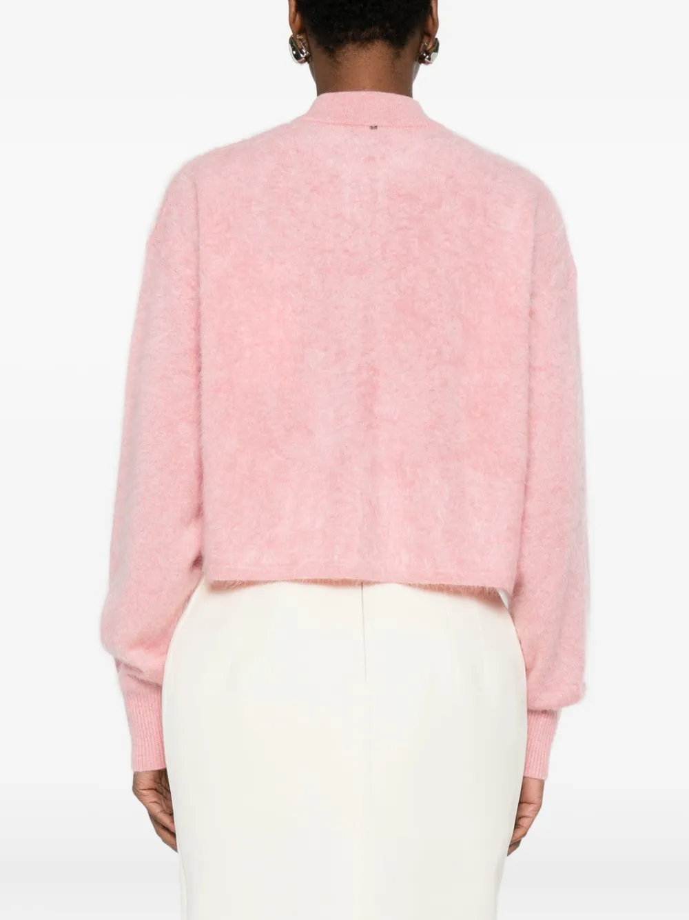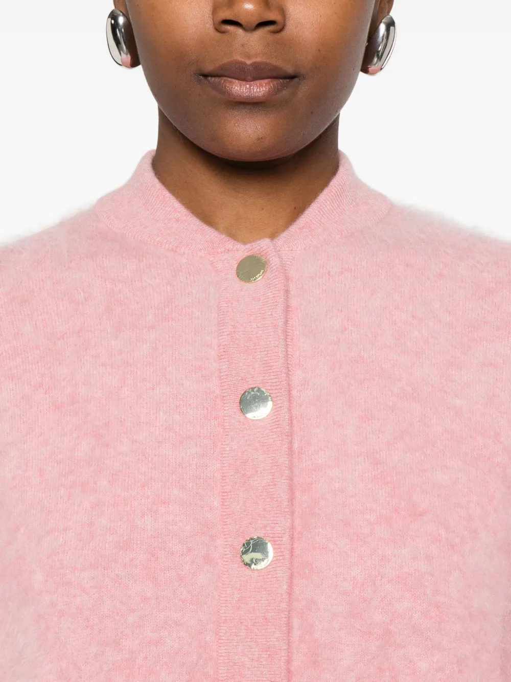 Розовый круглый вырез застежка на пуговицы спереди длинные рукава ребристые манжеты и низ