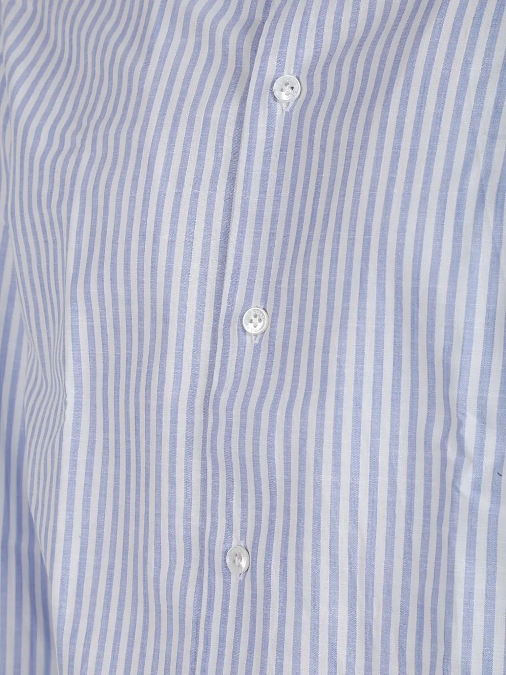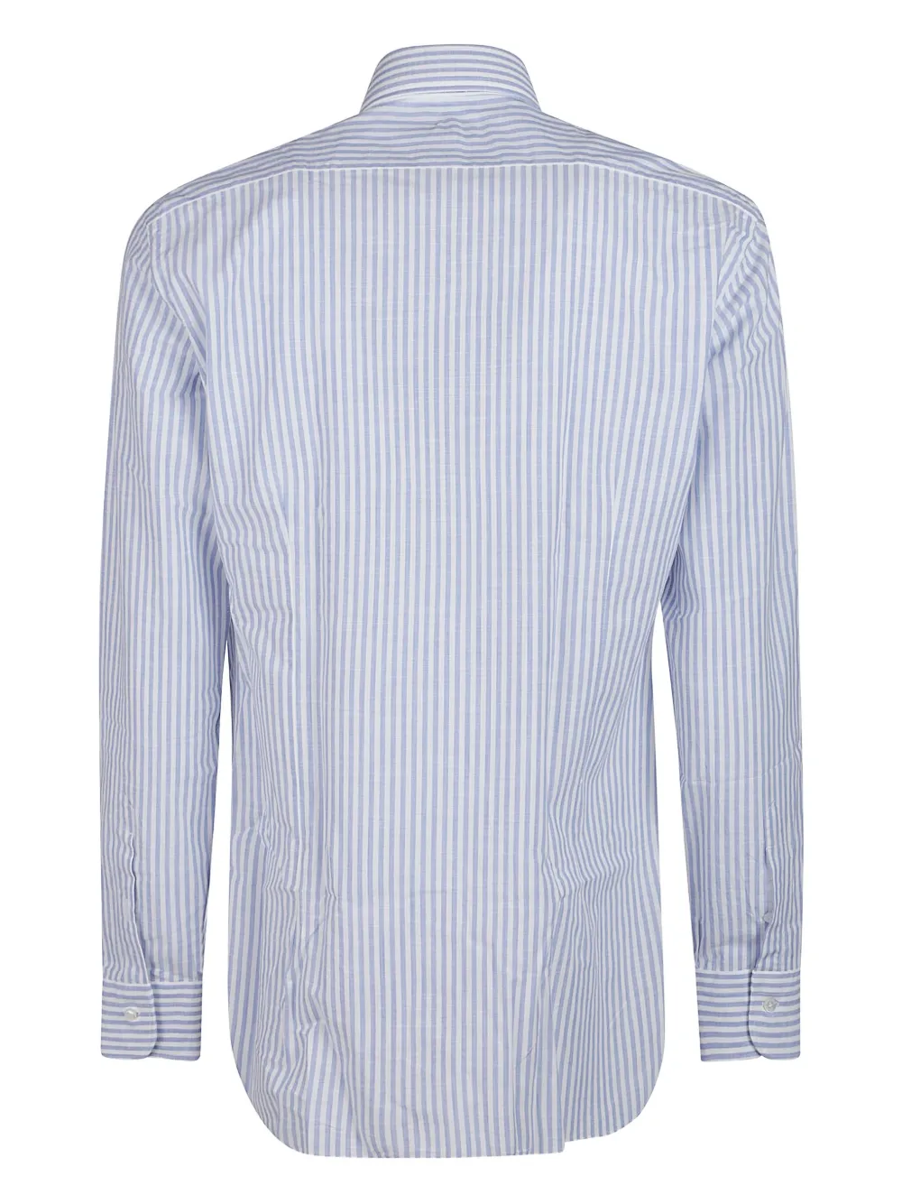 Белая рубашка с синими вертикальными полосками, застежка на пуговицы спереди, длинные рукава, манжеты на пуговицах, хлопковый материал