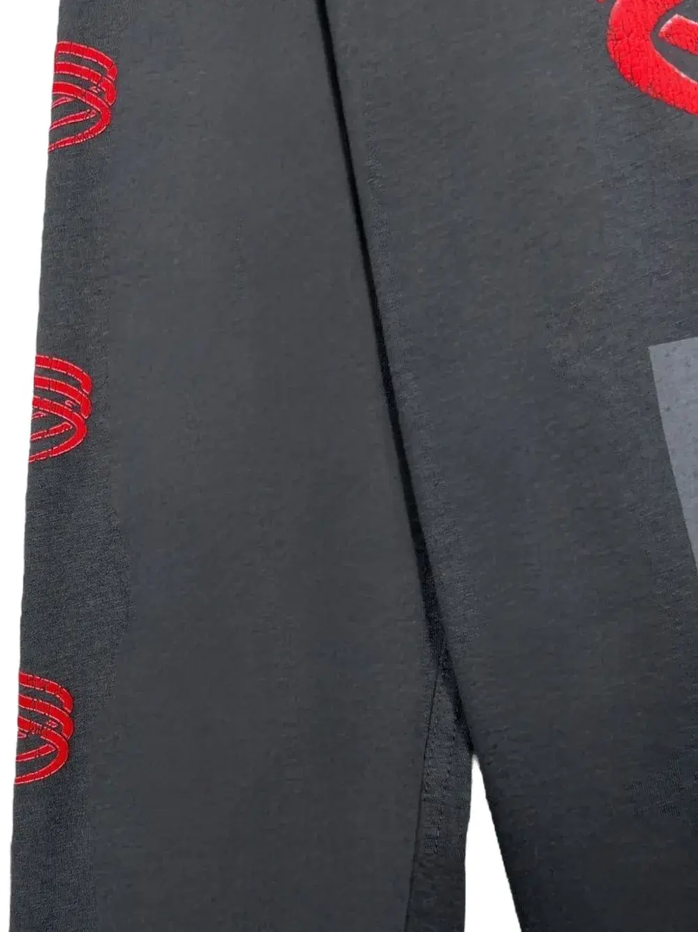 Серый свитшот с красным принтом-логотипом, длинными рукавами, повторяющимся логотипом на рукавах, графическим принтом и круглым вырезом