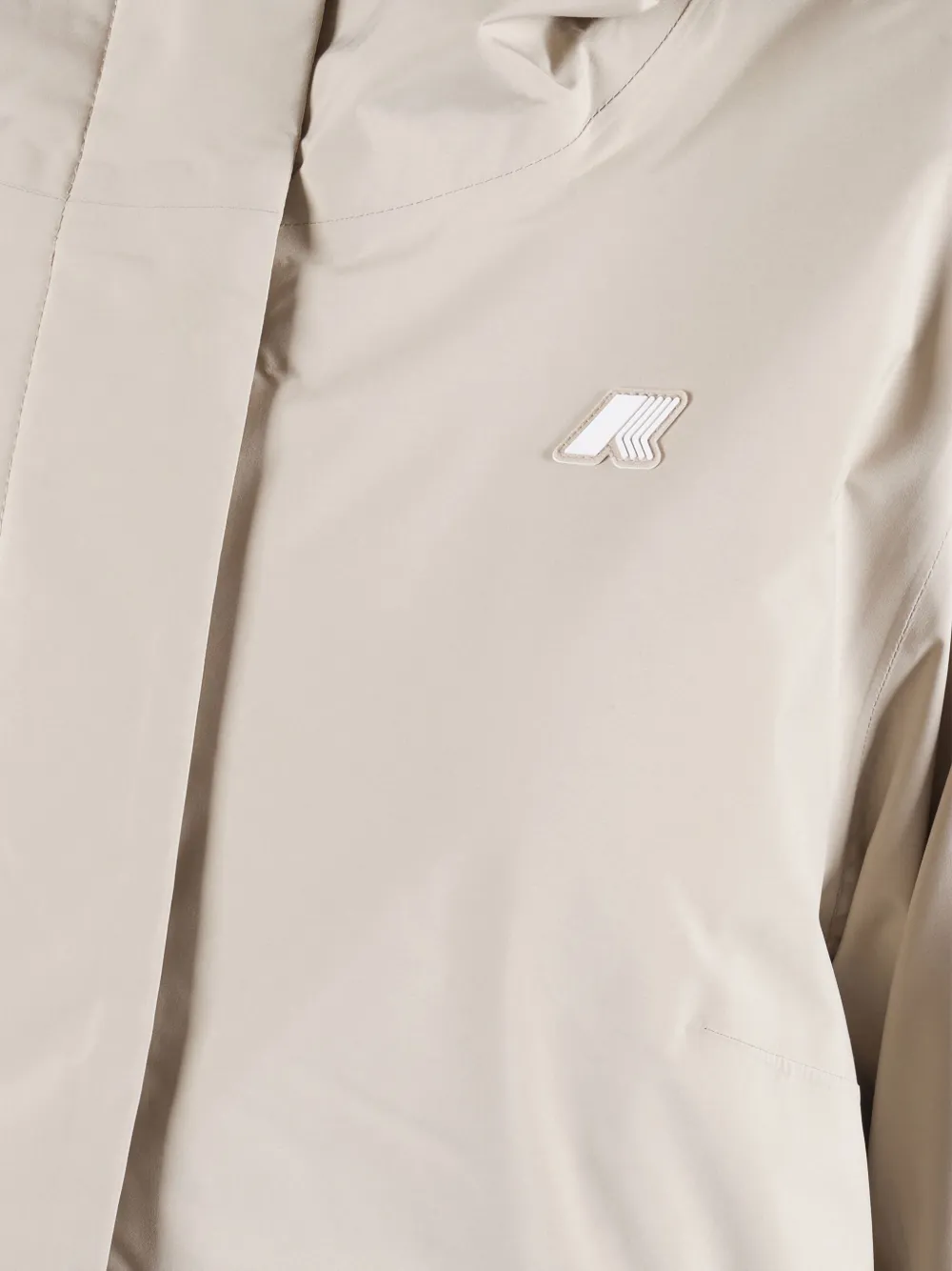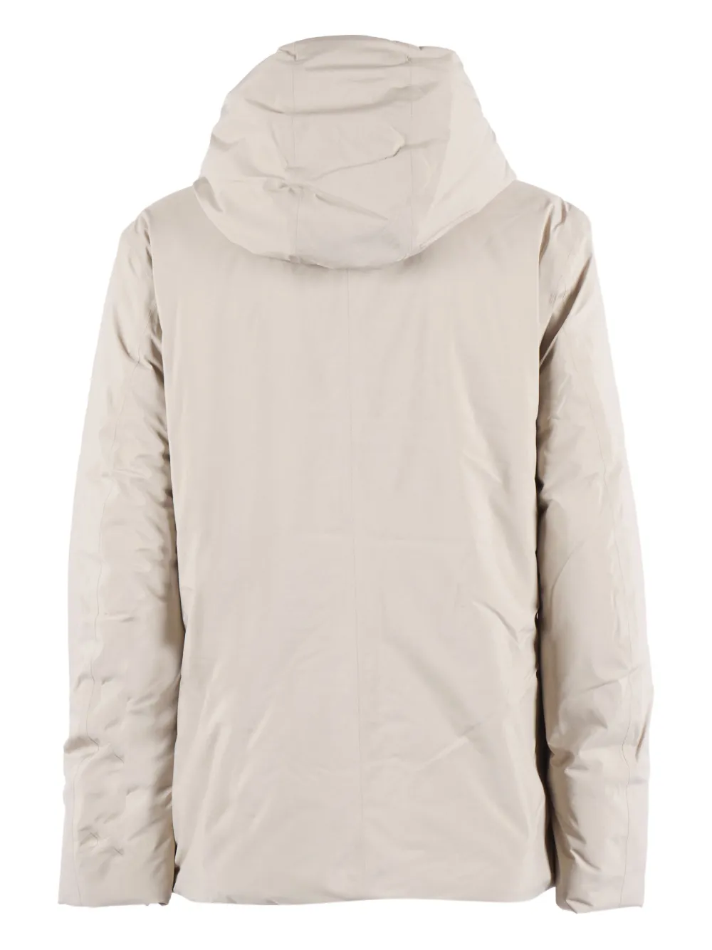 Бежевый пуховый дизайн, капюшон, застежка-молния спереди, длинные рукава, нашивка с логотипом