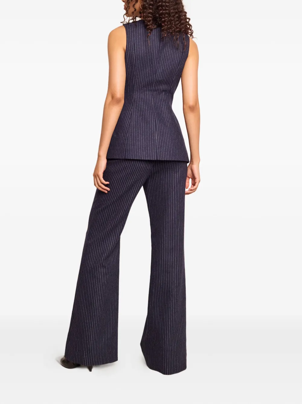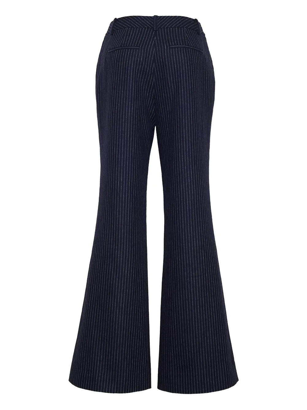 Темно-синий цвет в тонкую полоску, расклешенные штанины, застегиваются на пуговицу и молнию