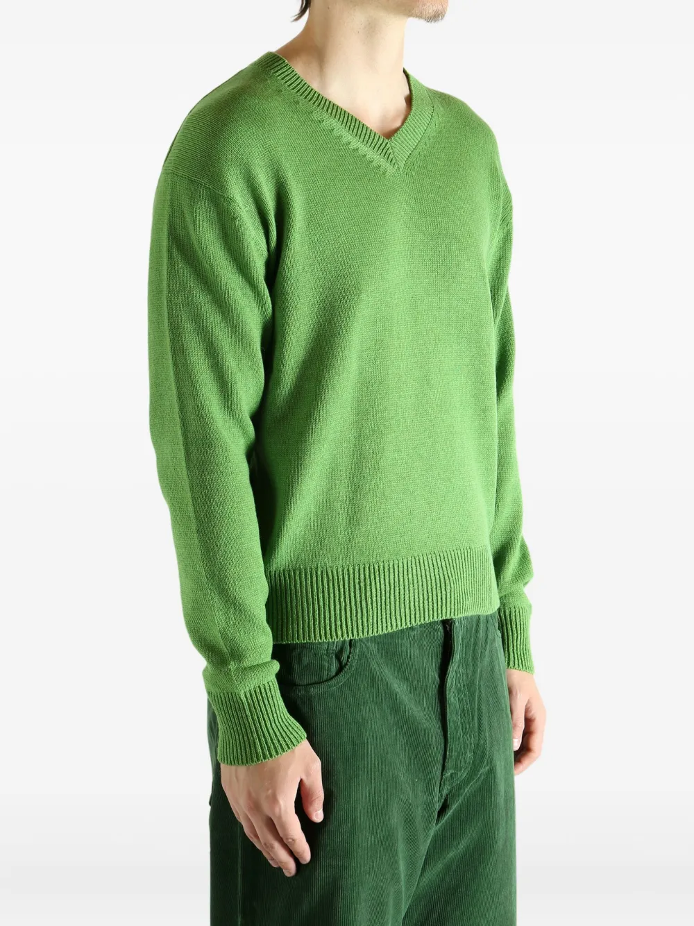 Зеленый вязаный пуловер с V-образным вырезом и ребристыми краями