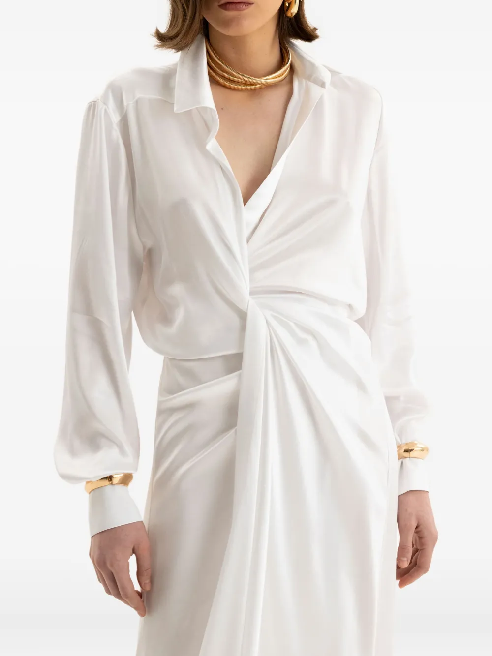 Белый эффект сатина деталь с перекрутом спереди воротник длинный рукав асимметричный подол