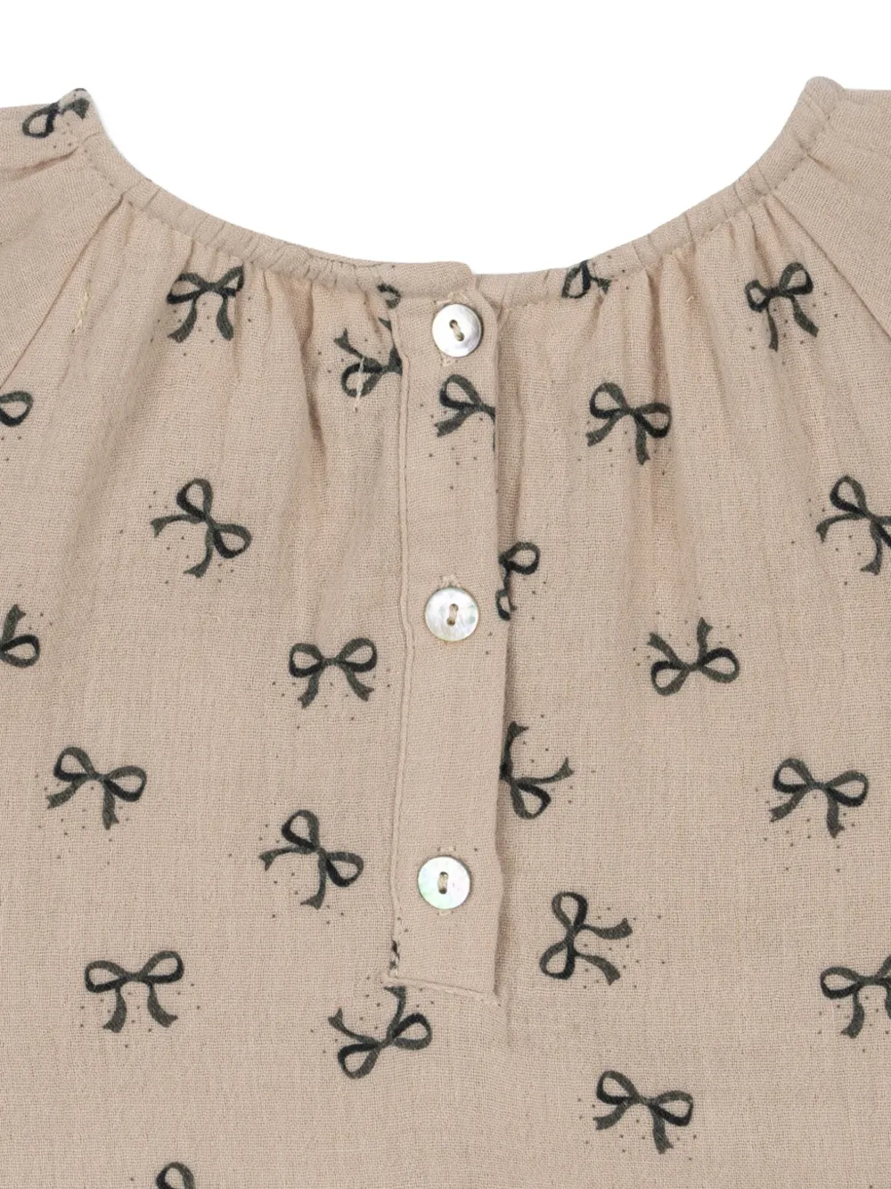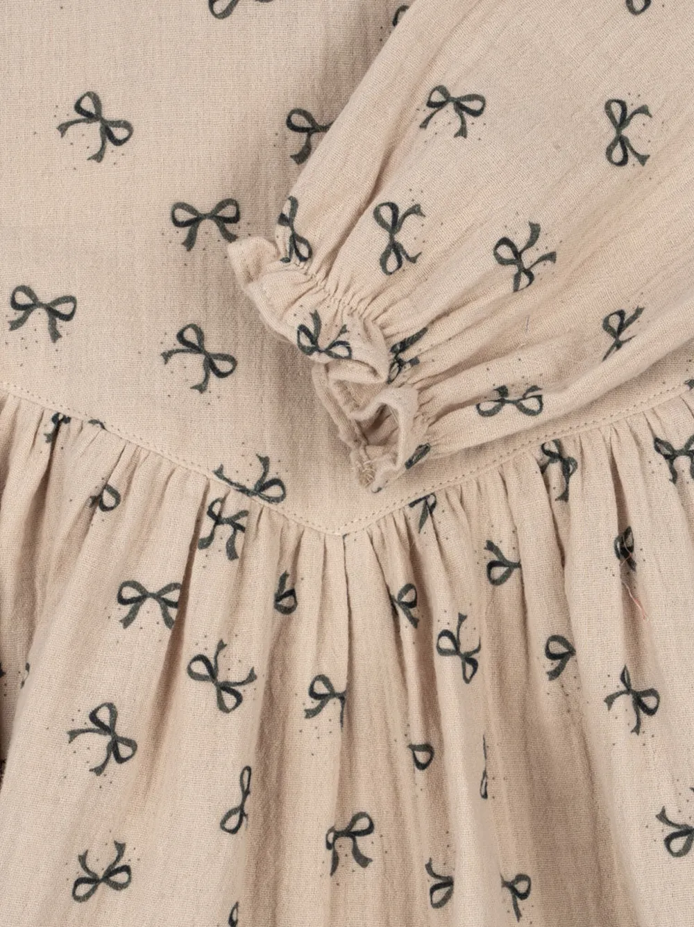 Бежевый цвет, принт с бантом, застежка на пуговицы, длинные рукава, сборки, круглый вырез