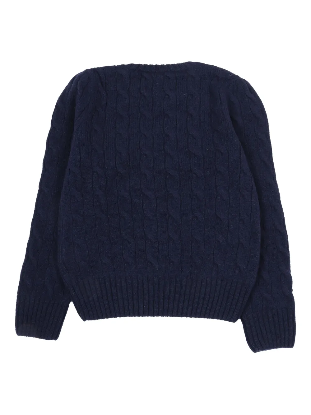 Темно-синий свитер из шерсти с кашемиром, вязаный косами, круглый вырез, пуговицы на плечах, вышитый логотип