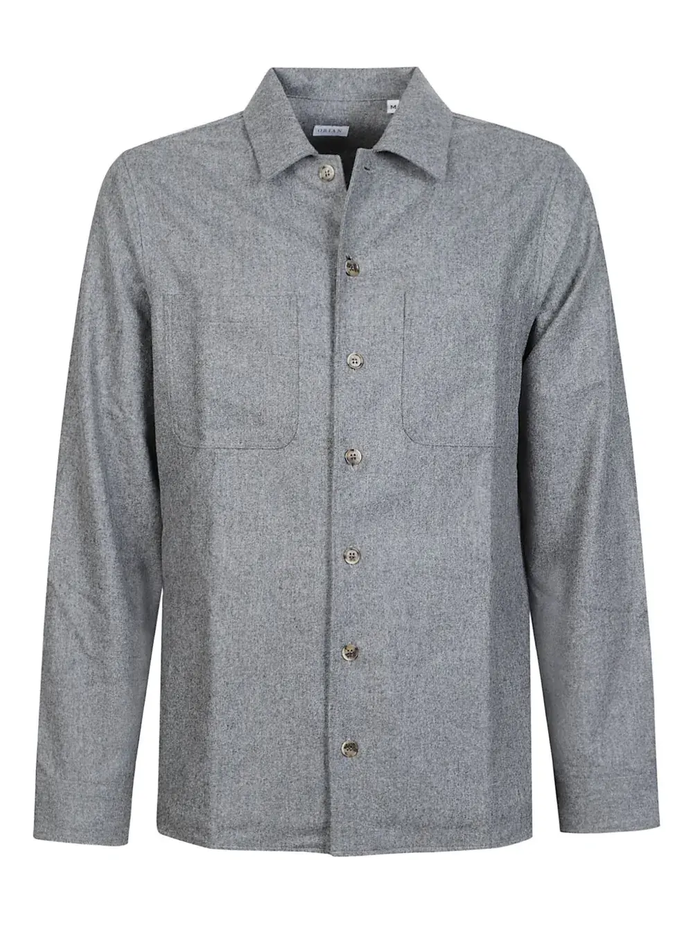 Серый шерстяной материал, длинные рукава, застежка на пуговицы, нагрудные карманы