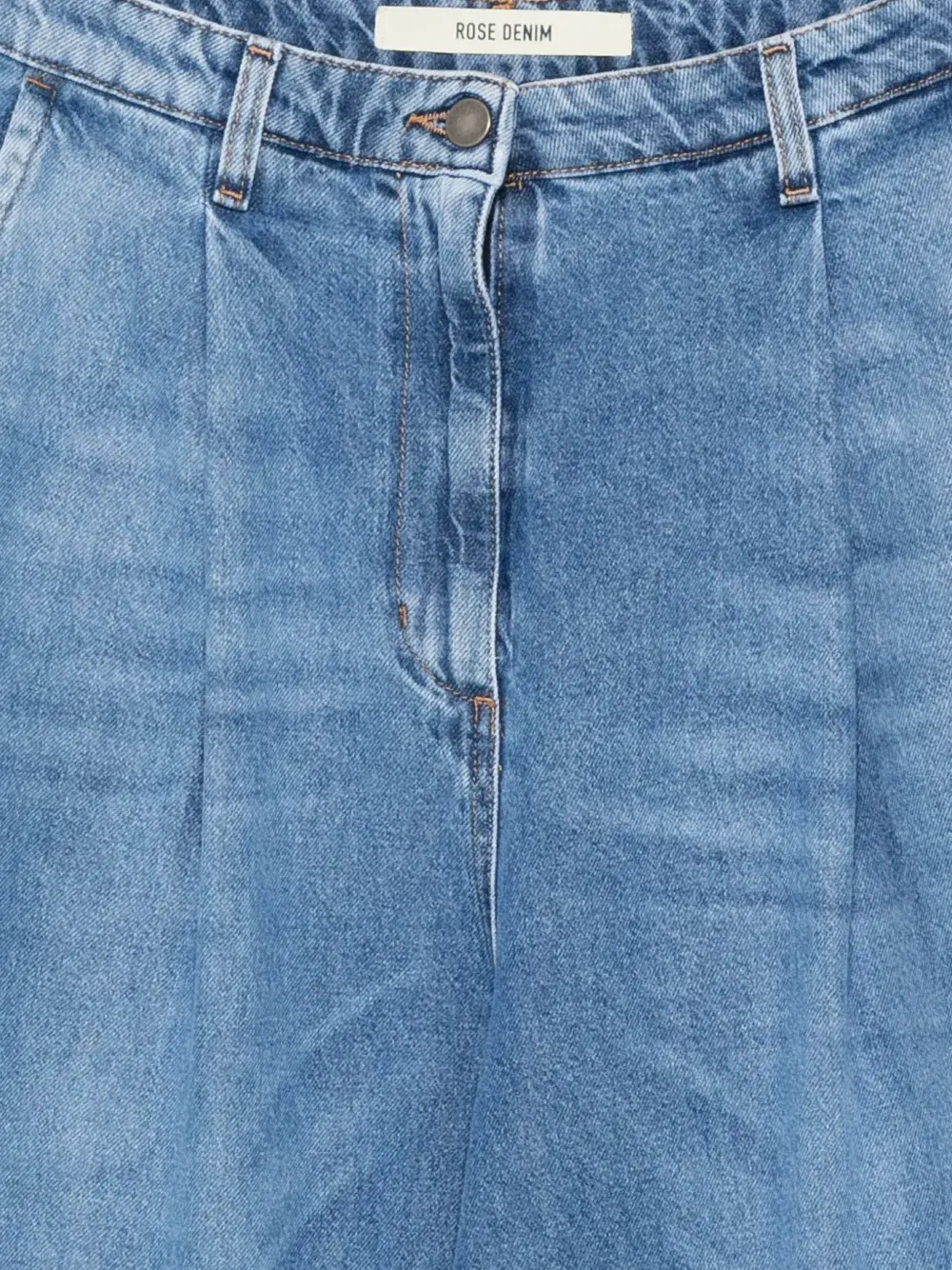 Светло-голубые брюки с защипами спереди, гульфик на пуговицах, прорезные карманы, высокая талия