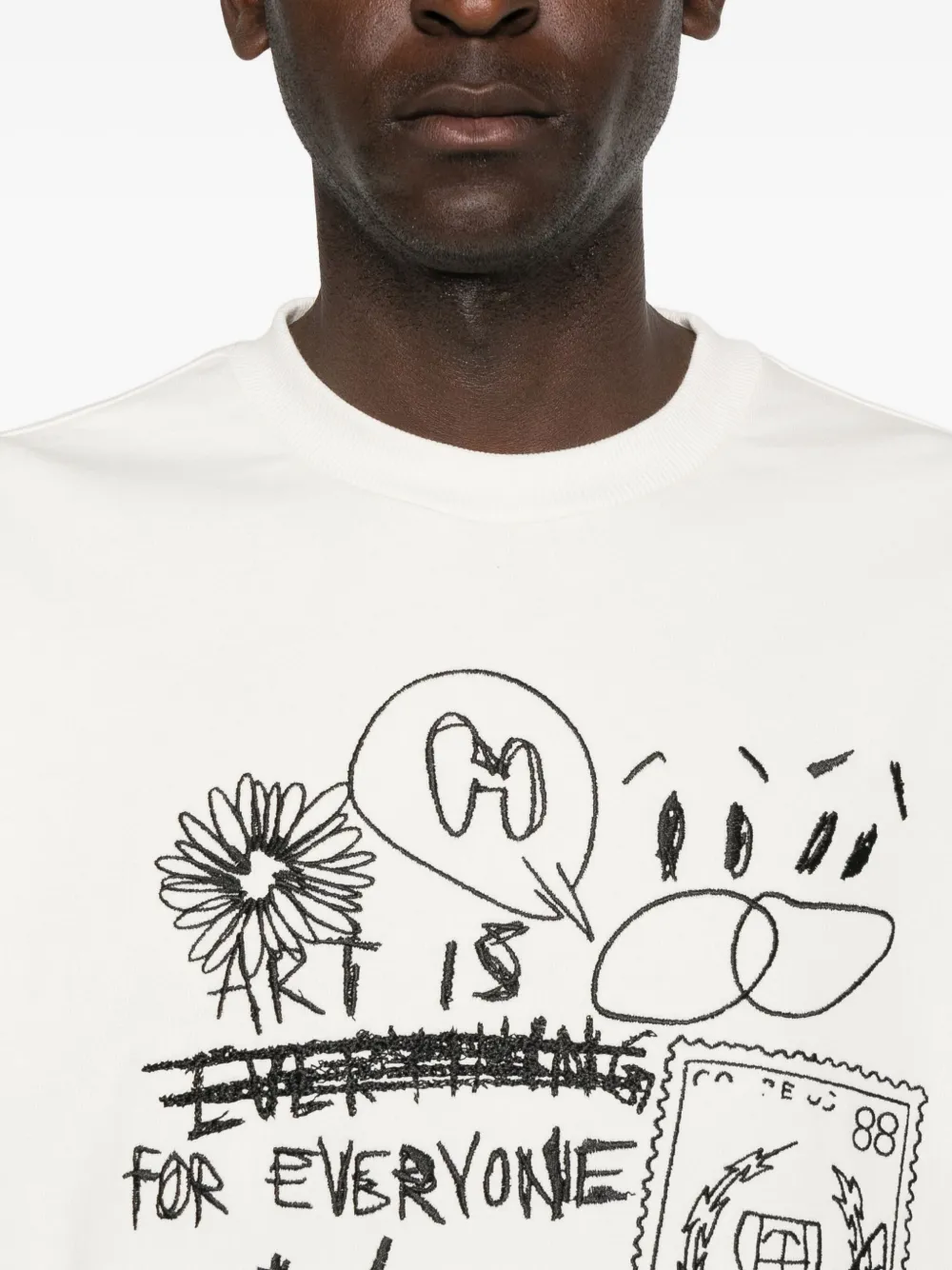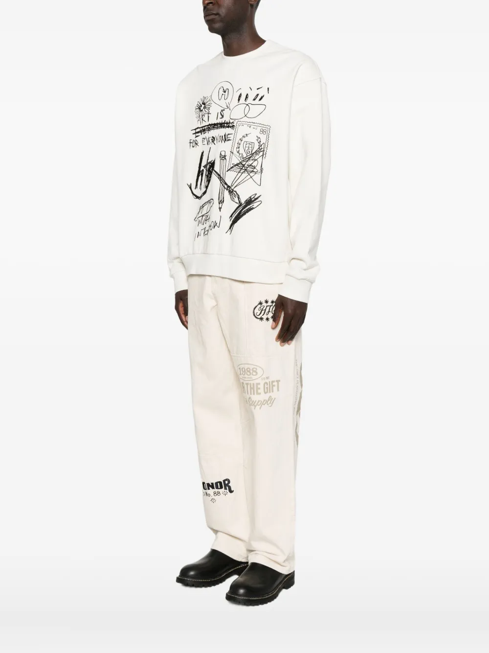Белый графический принт круглый вырез длинные рукава ребристый нижний край ребристые манжеты