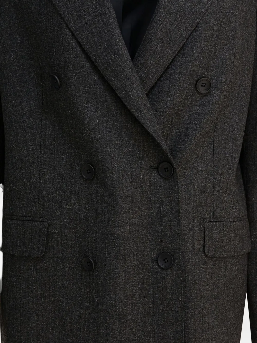 Темно-серый двубортный пиджак, застежка на пуговицы, лацканы с острыми концами, длинные рукава, прямой подол