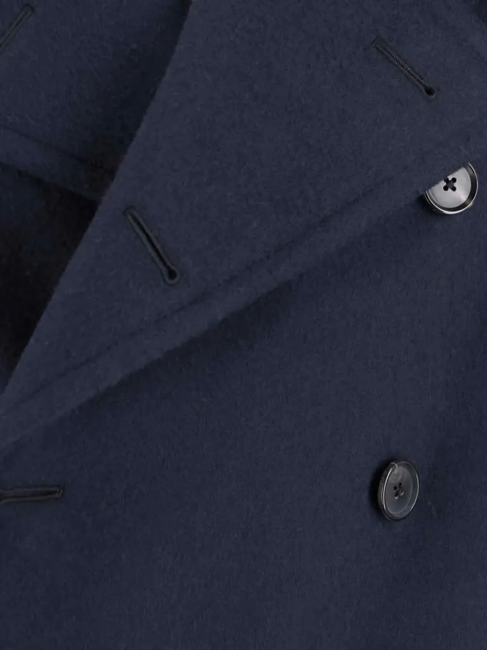Темно-синий двубортный застежка, лацканы с острыми концами, манжеты на пуговицах, прорезные карманы, прямой низ