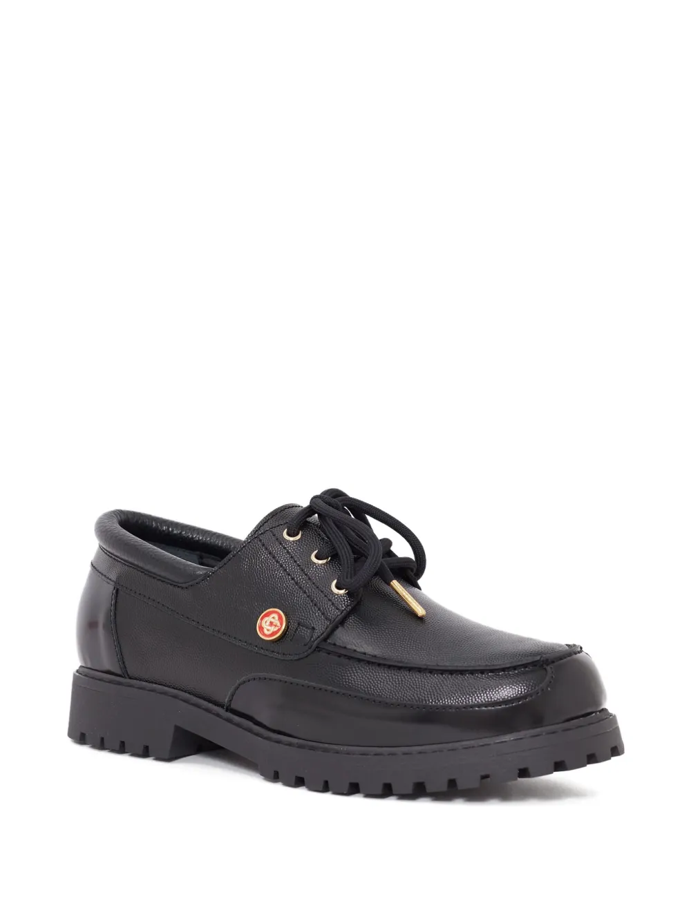 Черные кроссовки с логотипом, шнуровкой, рифленой резиновой подошвой и круглым носком